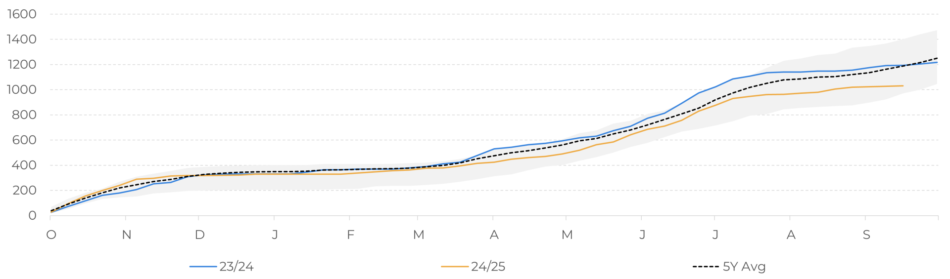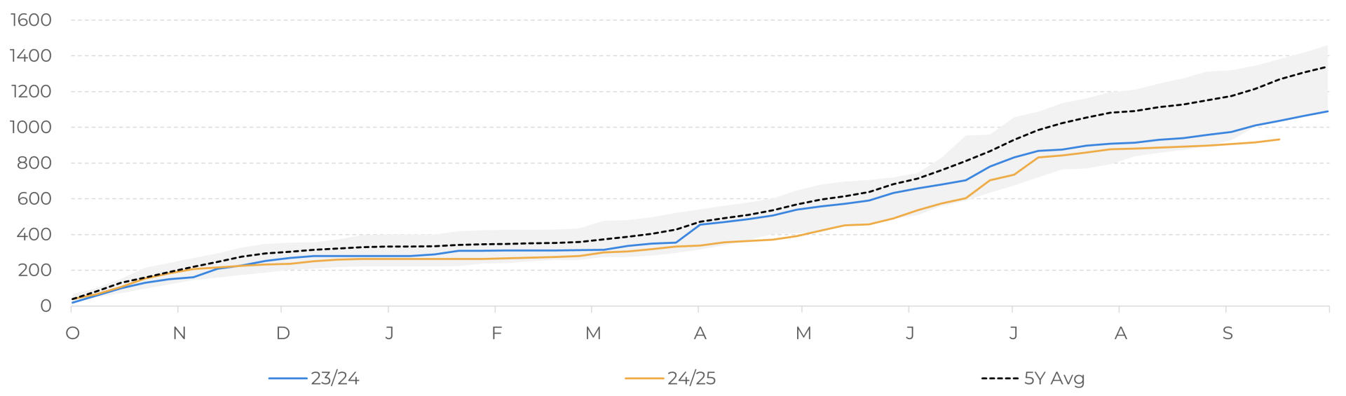 In that sense, weather in the major producing regions remains one of the most closely watched drivers. Despite light rains in some key areas last week, accumulated rainfall in Ivory Coast and Ghana is on track to finish the 2024/25 cycle (Out/24 to Sep/25) below average, as in the previous season.