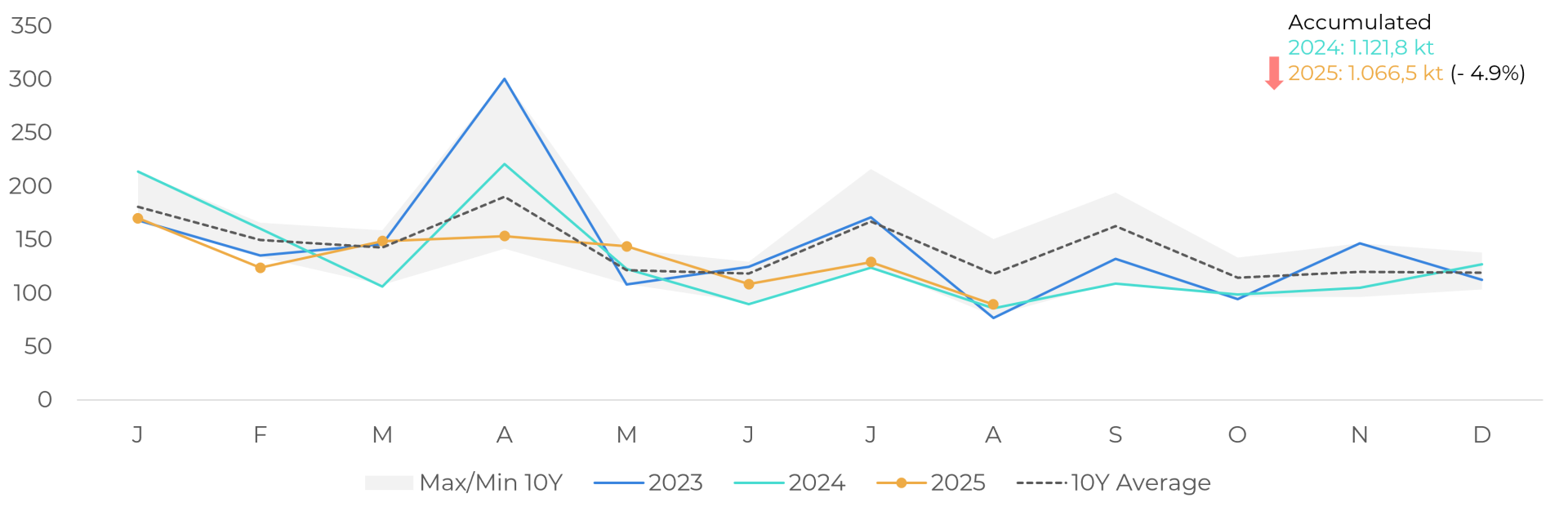 - In the European Union, net imports are down nearly 5% compared with 2024, reflecting higher procurement costs.