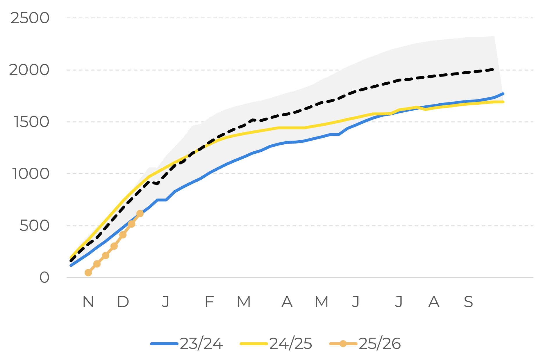On the supply side, the 25/26 crop begins with signs of recovery in some regions, but still under significant weather influence. In Ivory Coast, the initial delay in arrivals is gradually being reversed, and the accumulated volume is approaching the level seen in the last crop. Even so, local authorities have highlighted concerns about weather patterns in the coming months, especially for the development of the mid-crop, noting that unfavorable conditions last season compromised volumes and quality. In Ghana, accumulated rainfall remains close to average, but there are risks associated with the high incidence of disease in aging crops.
