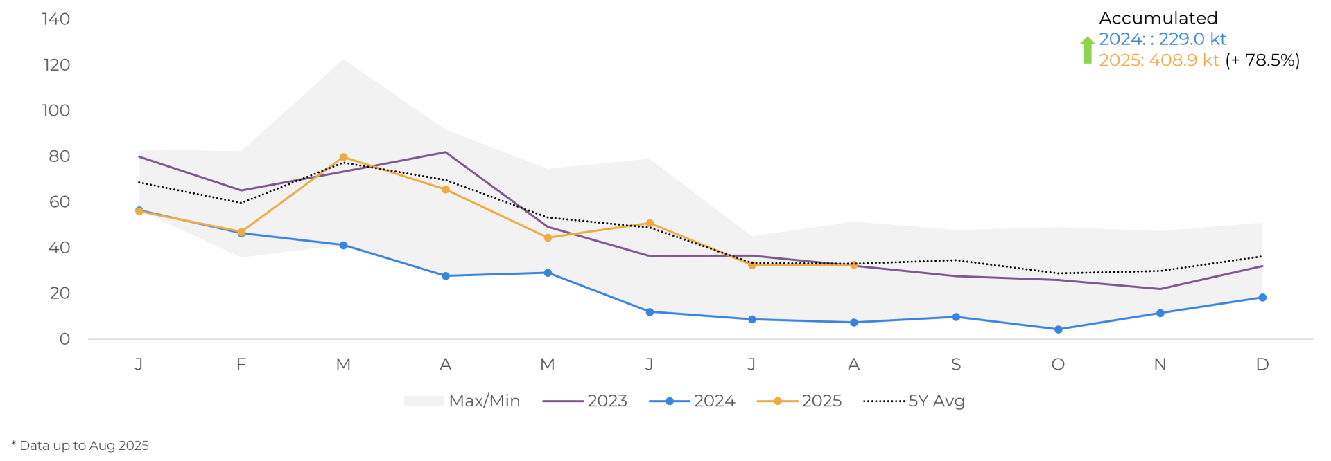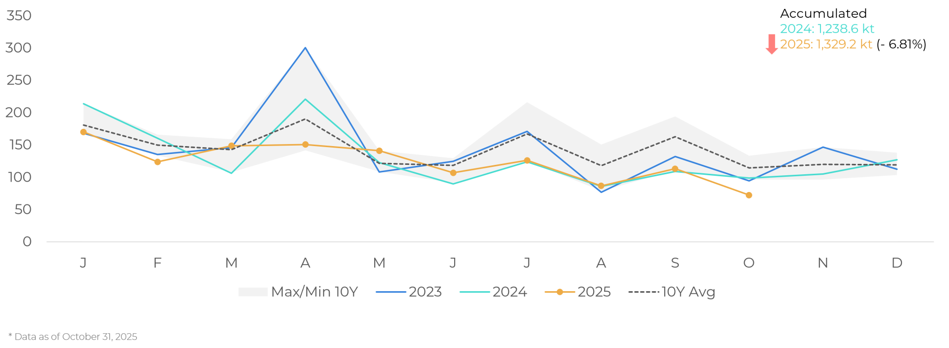 In terms of demand, the US continues to show a more resilient outlook. Net cocoa imports returned to growth in August after the data interruption during the shutdown, remaining close to the historical average. In the year to August, volumes grew significantly compared to 2024, driven mainly by imports of beans, signaling continued stronger demand in North America.