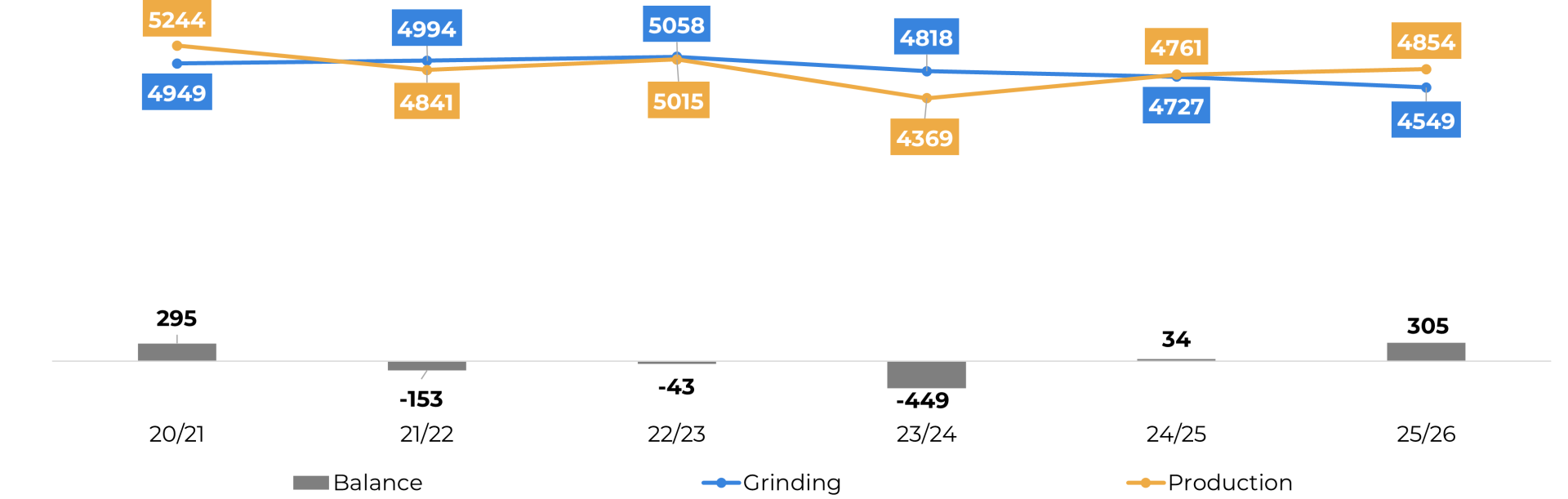 - The combination of a partial recovery in production in relevant origins, a slowdown in grinding in Europe and Asia, and greater resilience in demand in the United States supports the expectation of a surplus for the 25/26 season and explains the recent trend of price correction.