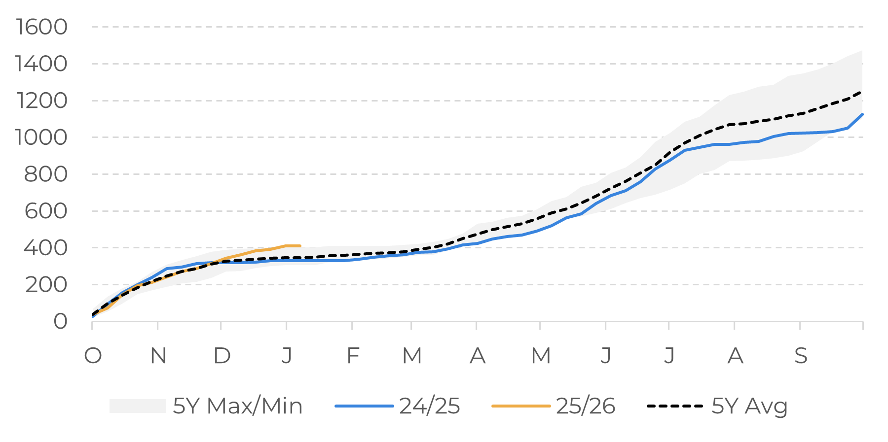 In general, the market continues to await new information related to fundamentals. In this sense, speculative funds remained almost stable in New York according to the latest report released on January 5, at levels still below the average and the same period corresponding to the previous year, a scenario that reflects both the caution of participants and the reduction in activity observed during the year-end holiday period.