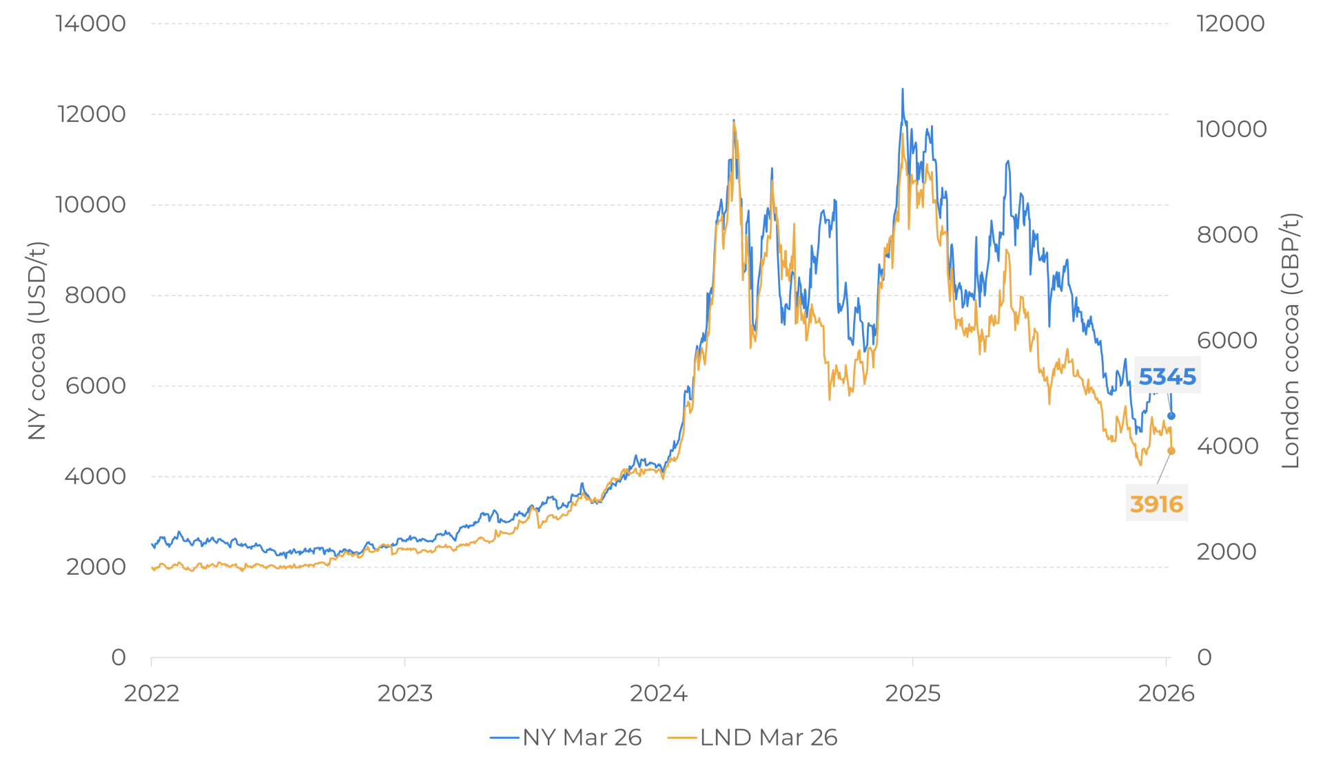 Cocoa futures ended the first week of 2026 trading at 5,345 USD/t in New York and 3,916 GBP/t in London, accumulating weekly losses of 8.96% and 7.81%, respectively, reversing the gains of the previous session. With no significant changes in fundamentals, the main drivers of recent movements remain associated with weather and technical factors.
