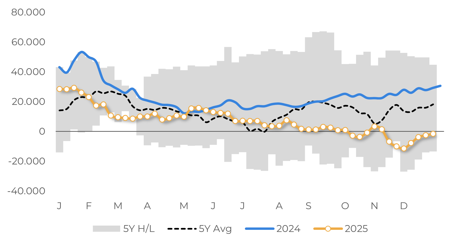 - The speculative funds positioning remains almost stable and below the historical average, reflecting both the caution of participants and the lower activity typical of the year-end holiday period.