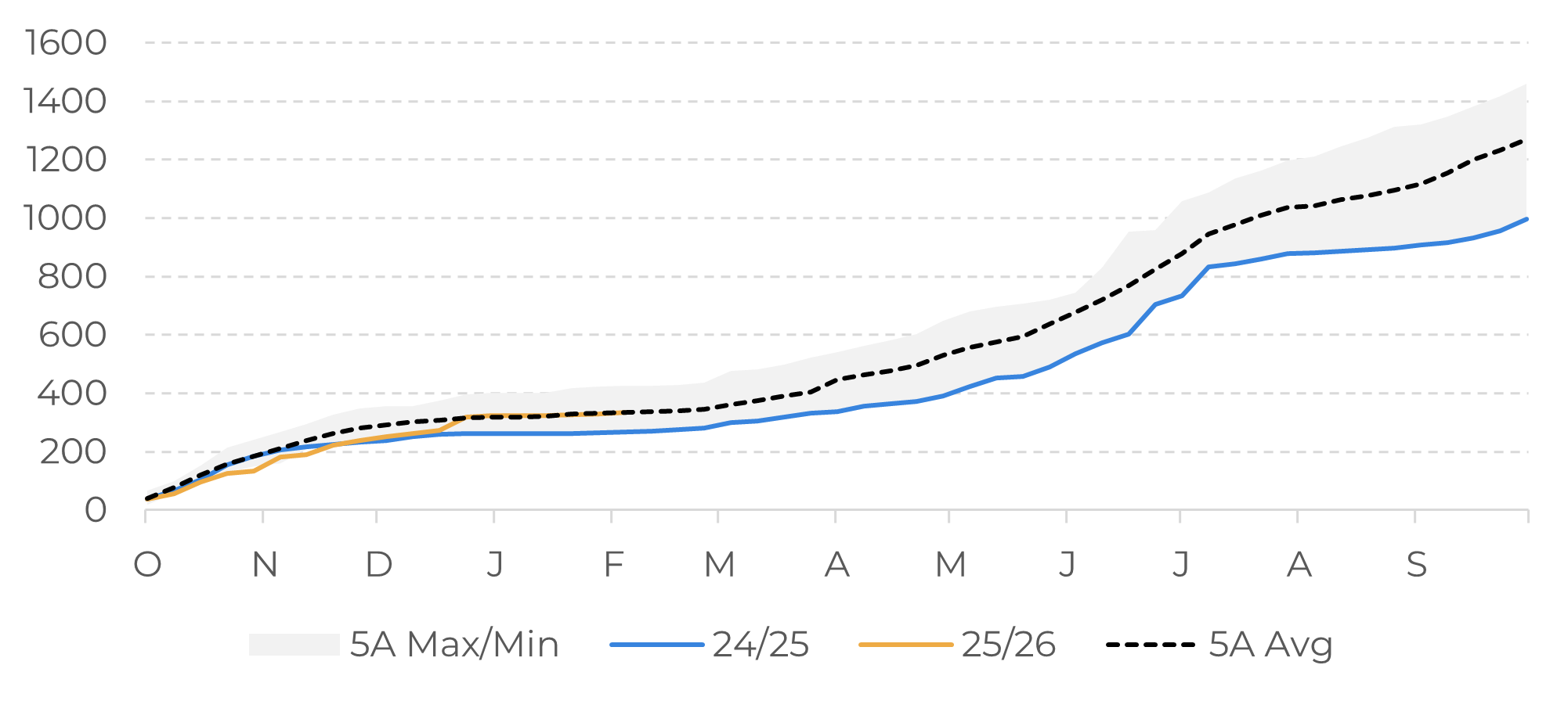 A similar situation is observed in Ghana, where the change in the marketing model adopted for the 2024/25 crop altered the dynamics of sales. In addition, the increase in the price paid to producers has contributed to a slower pace of marketing. Together, these factors can create operational challenges, such as possible delays in payments, which tend to limit investments in crops and may affect production performance in future cycles if the scenario persists.