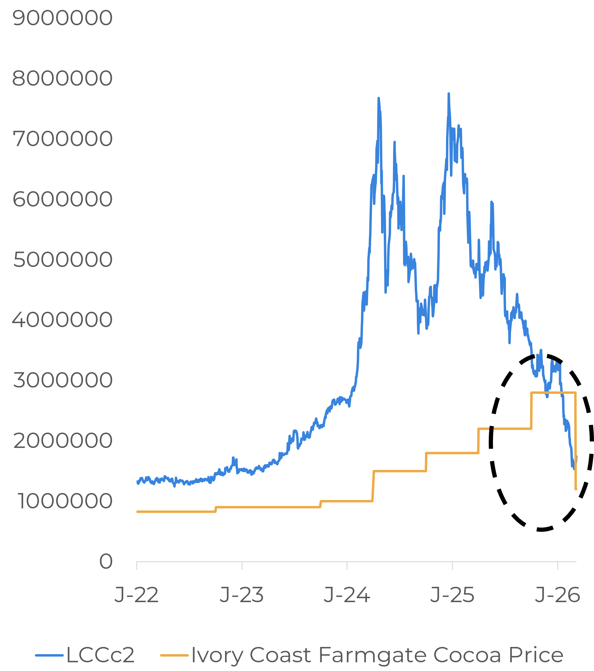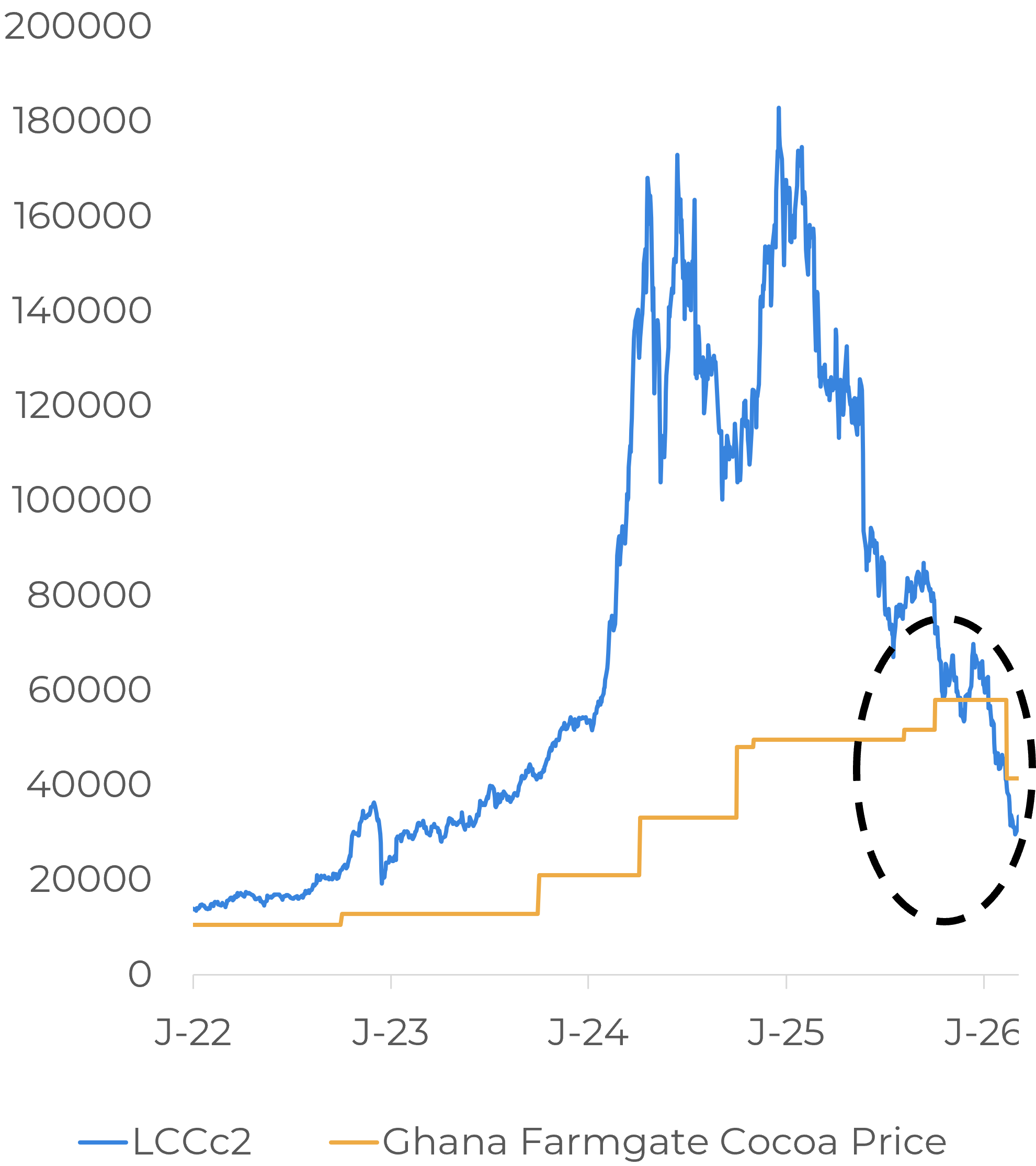 Farmgate prices has been an important factor in understanding the recent problems in trade flows from Ivory Coast and Ghana. With futures falling, domestic prices set by regulators in both countries rose above market levels, which created difficulties in sales and affected the pace of exports. During Hedgepoint Outlook 2026, we expected Ivory Coast to cut the price paid to producers, a move that was confirmed this week. On Wednesday, March 4, the country announced a reduction of about 57% to 1,200 CFA francs per kg. Ghana had already made a similar adjustment earlier.
