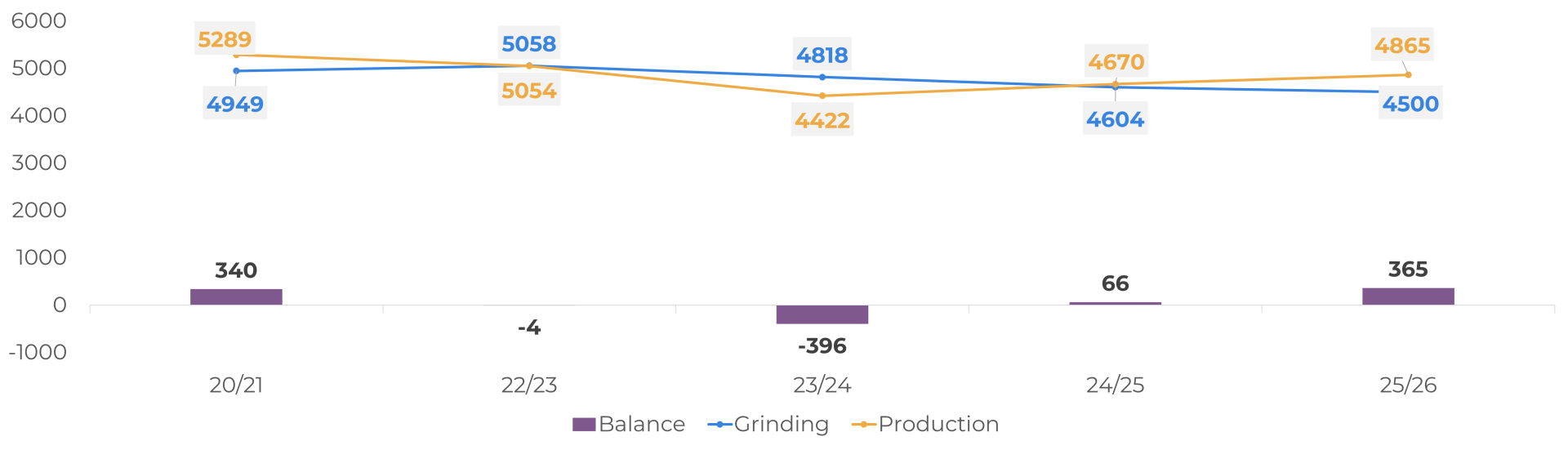 Based on this scenario, the current estimate points to a global surplus of around 365 kt in the 25/26 season, resulting from a partial recovery in production (+4.2%) combined with a decline in demand (-3.0%). Even so, despite the expected surplus, the balance remains relatively sensitive, so that any change in fundamentals could have a significant impact on the cocoa market balance and contribute to market volatility.