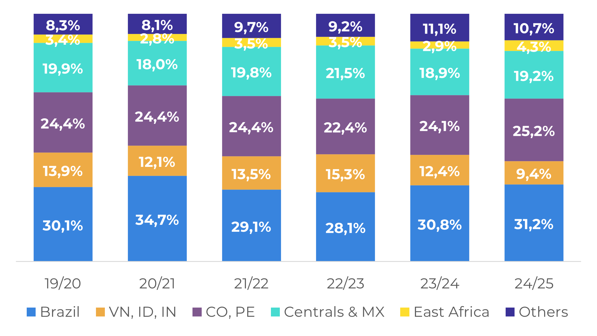Most of the other coffee-producing countries are now on their development period for the 25/26 season. In Asia, Vietnam is expected to have a recovery in production, given higher investments and positive weather conditions, despite a drier July. Production in Central American countries are also expected to be similar or slightly higher than in 24/25, due to better weather prospects, with an ENSO-neutral scenario. However, we could further decrease Colombia production, given excessive rainfall during the flowering period.