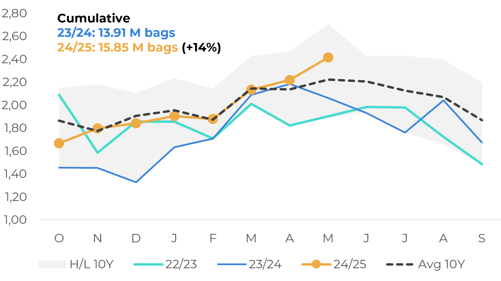 Despite the end of the harvest, sales in the physical market continue to be sluggish, with higher coffee availability. Many farmers have chosen to stay out of the market in recent months due to a price drop driven by harvest-related supply pressure. This has led to lower-than-average sales by farmers. With new concerns emerging around US’ trade policy, these conditions may persist.