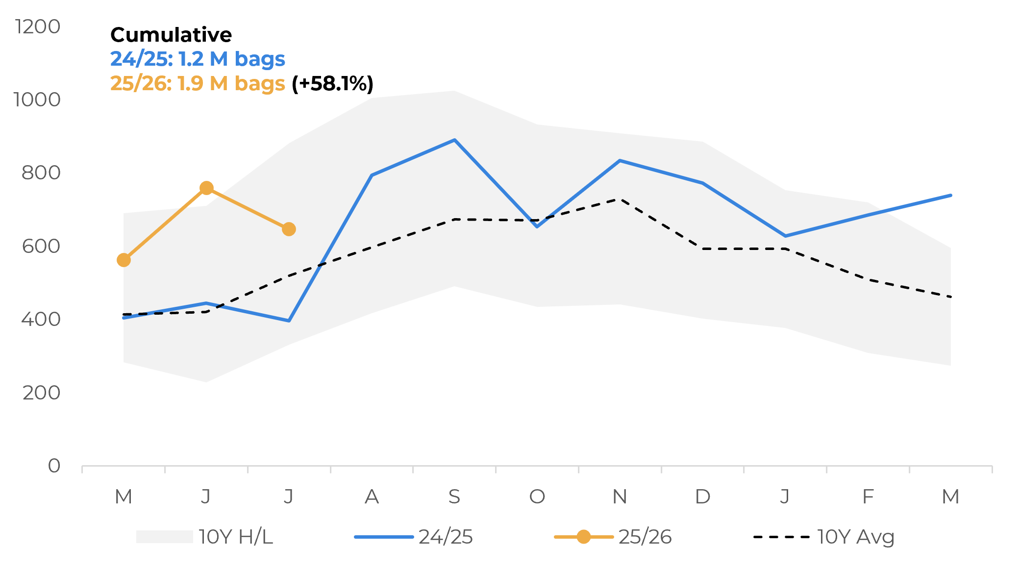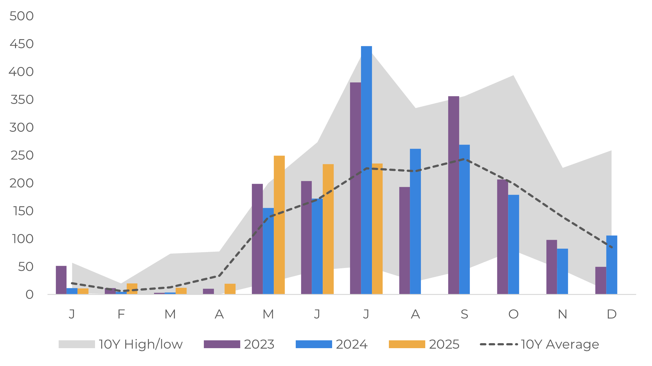 - Vietnam and Indonesia exports rose in the first half of 2025. For Vietnam, the volume was slightly below the 10-year average in some months, but still higher than the same period of 2024. In Indonesia, exports kept a strong performance, with shipments above 24/25 and the 10 –year average levels.