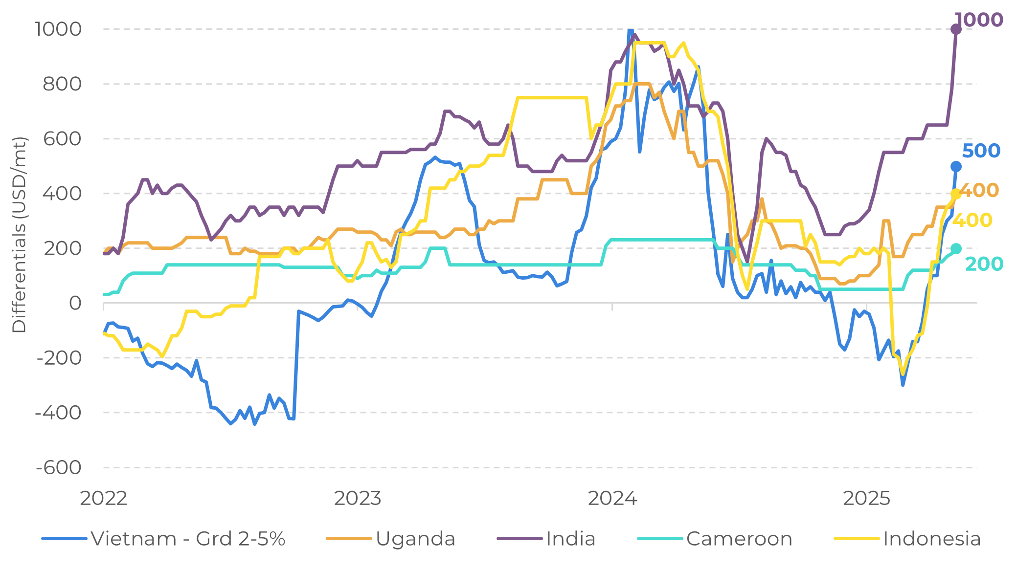 In Indonesia, farmers have already sold a significant portion of their 25/26 inventory and are waiting for higher prices before selling the remainder, also supporting differentials. The country has also experienced intense rainfall in recent weeks. Although no major losses were reported, the rains disrupted the end of the harvest and slowed trade. Conversely, reports of a decrease in demand for Asian coffees have also emerged. This could reflect both the recent changes in differentials and the expectation of increased Brazilian Conilon availability in the second half of the year, as Brazil's 25/26 harvest is nearly finished.
