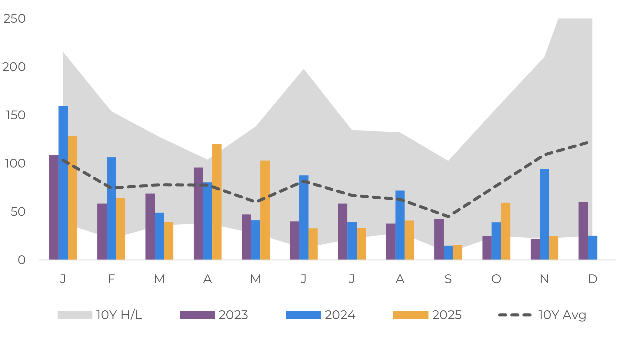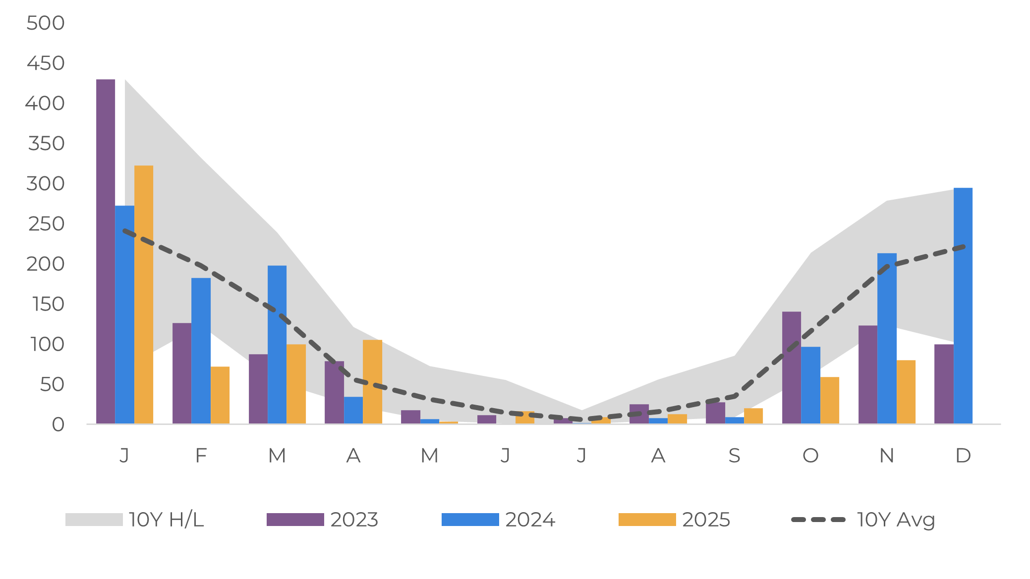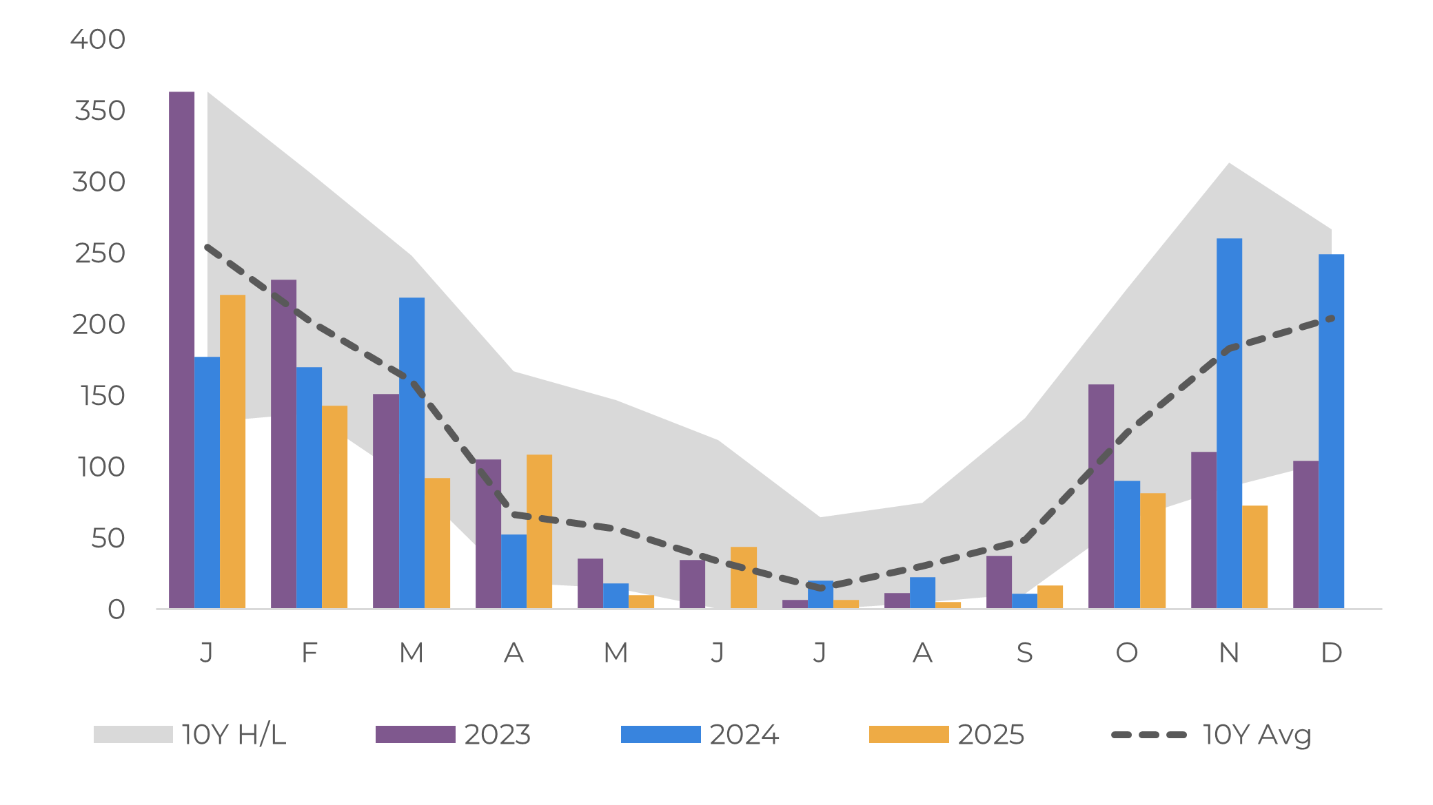 As for Conilon, the weather has been favorable throughout 2025, with a good amount of rainfall in these past weeks, which is helping the development of beans. There is, however, the possibility of a small drop in production in the next season, due to the record crop in 25/26. Usually, when trees produce a large amount, the next cycle is followed by a drop in production, as the reproductive effort tends to reduce plant vigor. Farmers usually prune these trees to increase their potential for the following season (27/28), which reduces the total crop output in the cycle. Meanwhile, there has also been an increase in Conilon areas in recent years, particularly in Espirito Santo and Bahia, which will help to offset some of the expected decline.