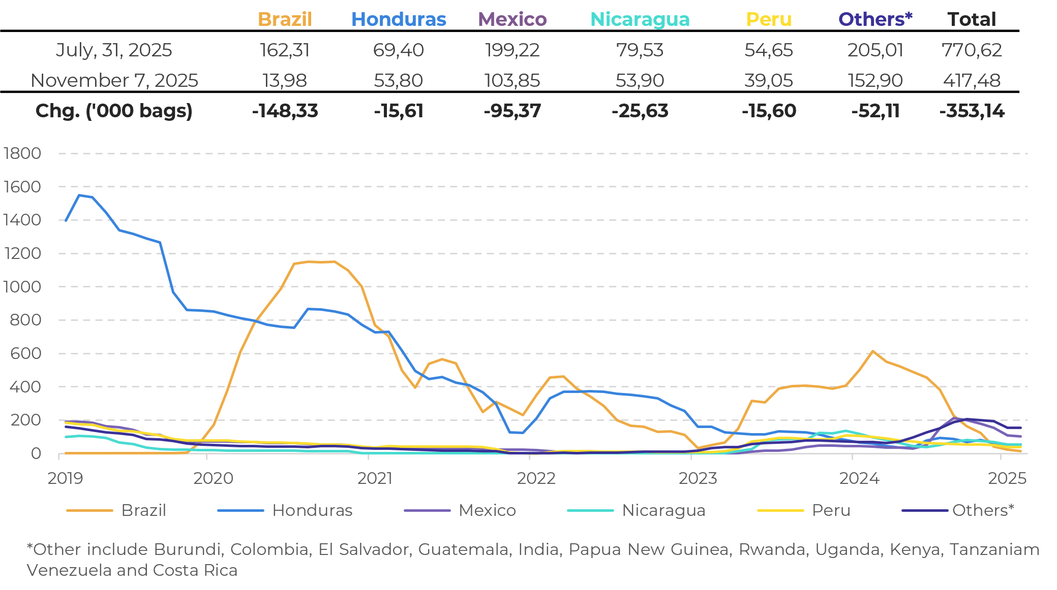 Since early August, certified stocks have been falling, with a decrease in the volume of most origins, including Mexico, Honduras, Nicaragua, Peru, Uganda and Brazil – the largest supplier of certified stocks in recent years. From 29 July to 7 November, total stocks plunged by 353.1 k bags (-43.8%), while the volume of Brazilian beans for the same period fell by148.3 k bags (-90.6%) . This reduction is the result of farmers' (especially Brazilian farmers') lack of interest in certified coffee, as they are well capitalized, and the price differentials previously did not compensate for the process. It is also the result of traders and roasters consuming the existing certified stocks, as coffee prices continue to increase. In the case of American companies, tariffs have also increased their costs, prompting them to consume the existing stocks.