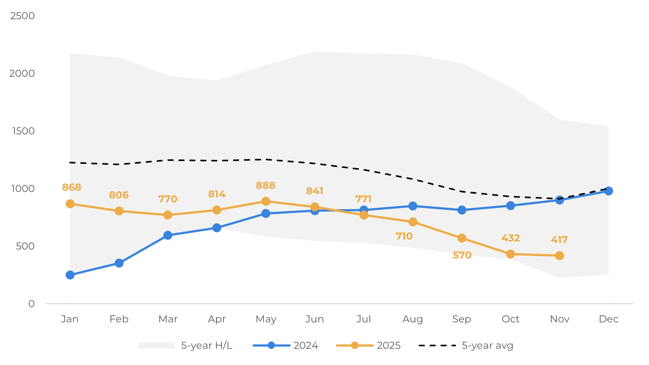 Weather has also been monitored closely in the past weeks and will also play a role in prices movements, as Brazil is currently in its development stage for the 26/27 cycle. Until mid-October, the weather remained dry in most producing regions, bringing some fears over the next season, as many coffee trees had early bloom in September. However, although it is still early to discard negative effect of the previous weather in coffee yields, the rain levels in the second half of October and early November brought hopes for 26/27.