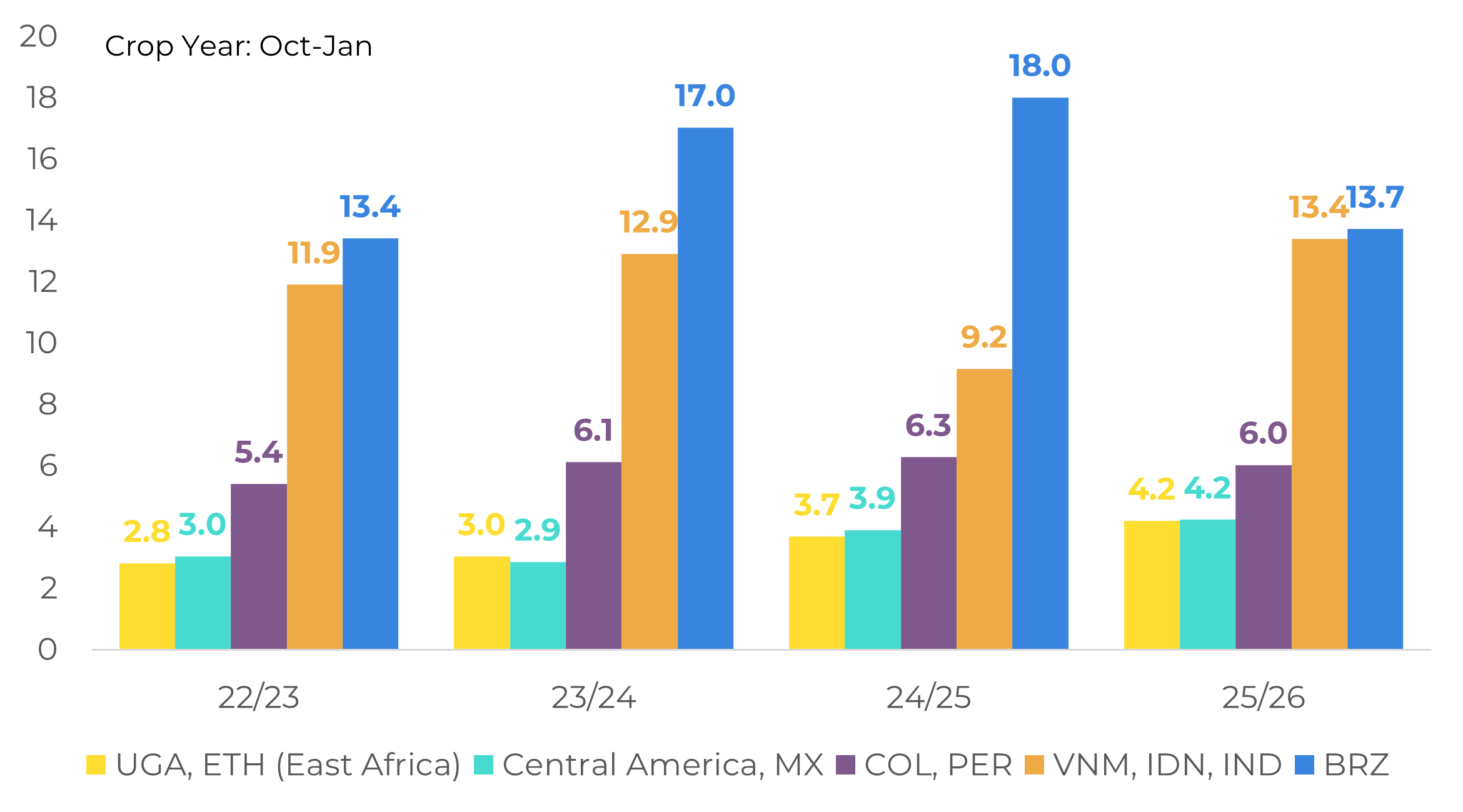 It is also important to recall that destination markets have significantly reduced coffee inventories – not only due to supply constraints in recent seasons, but also because of higher financial costs in the post pandemic environment of elevated interest rates. Higher coffee prices in recent years increased working capital requirements, prompting many importers to rely on short term supply while leaving inventories concentrated in producing countries. Although monetary policy began to ease in 2025, interest rates remain high, and renewed geopolitical tensions in the Middle East have dampened expectations of further easing. Combined with an inverted coffee market, this dynamic may reinforce stockholding in origins and lean inventories in consuming regions. At the same time, the prospect of a record Brazilian crop in the coming months allows roasters to continue operating on a hand to mouth buying basis, reinforcing this purchasing model.