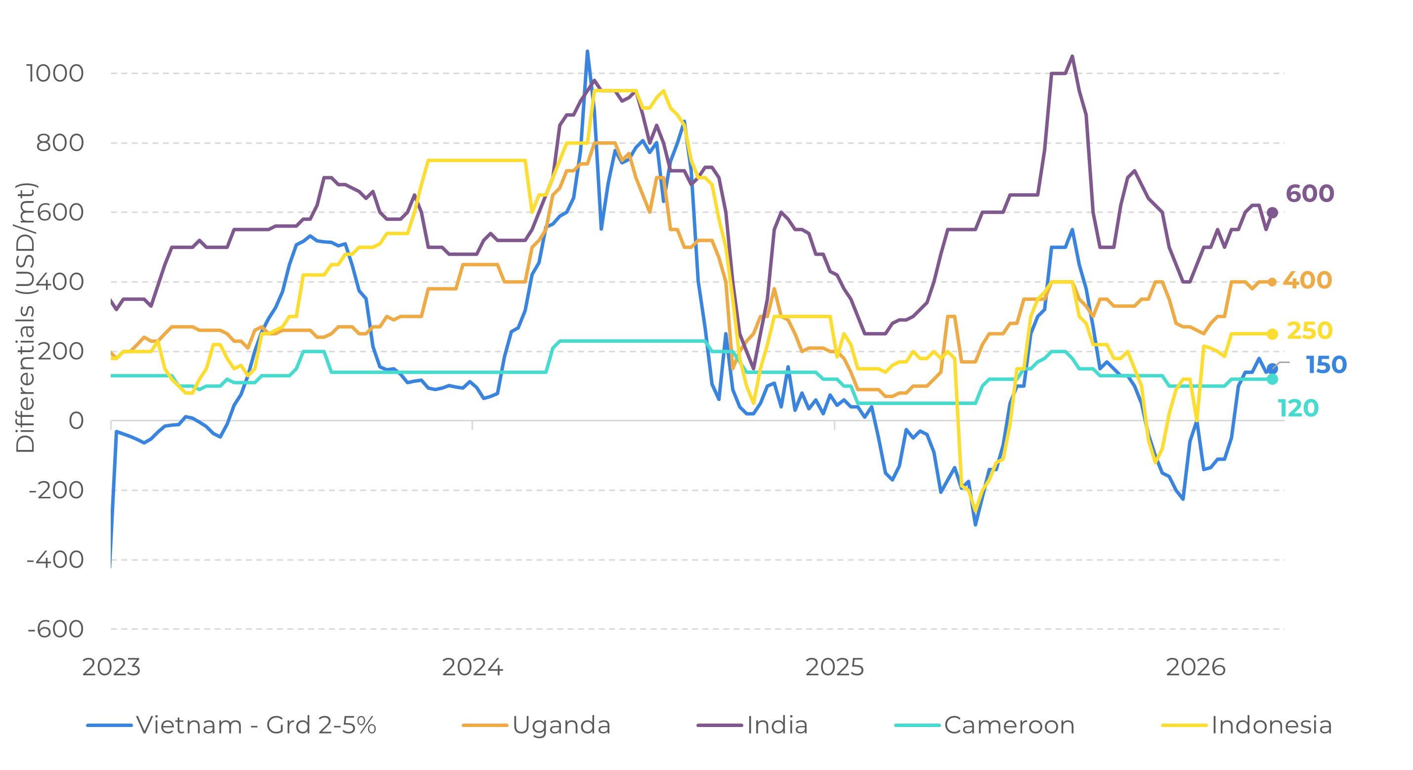 - In Brazil, farmers have been increasingly reluctant to sell since the end of 2025, affecting both Brazilian coffee exports and differentials, especially after disruptions to maritime routes in the Red Sea. Arabica 17/18 fine cup, which had been trading at a discount earlier this year, is now quoted at a premium of over 40 cents/lb.