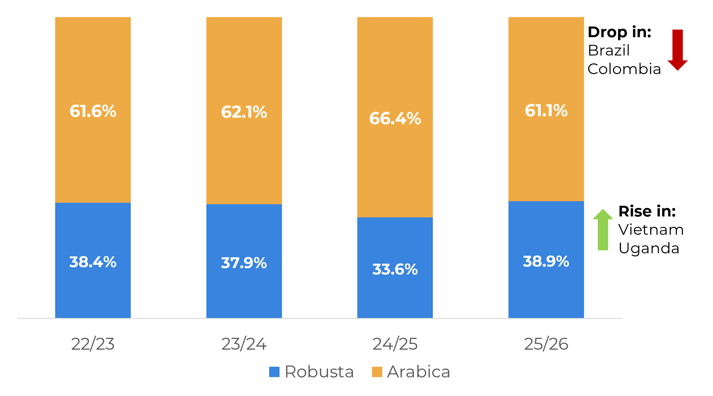 - Other origins are also experiencing rising differentials amid growing concerns over short‑term supply. Arabica and Robusta futures spreads are reflecting these supply-side worries as well.