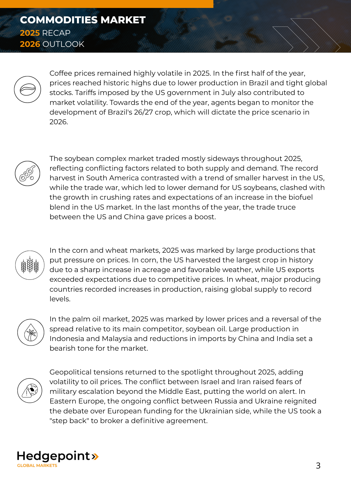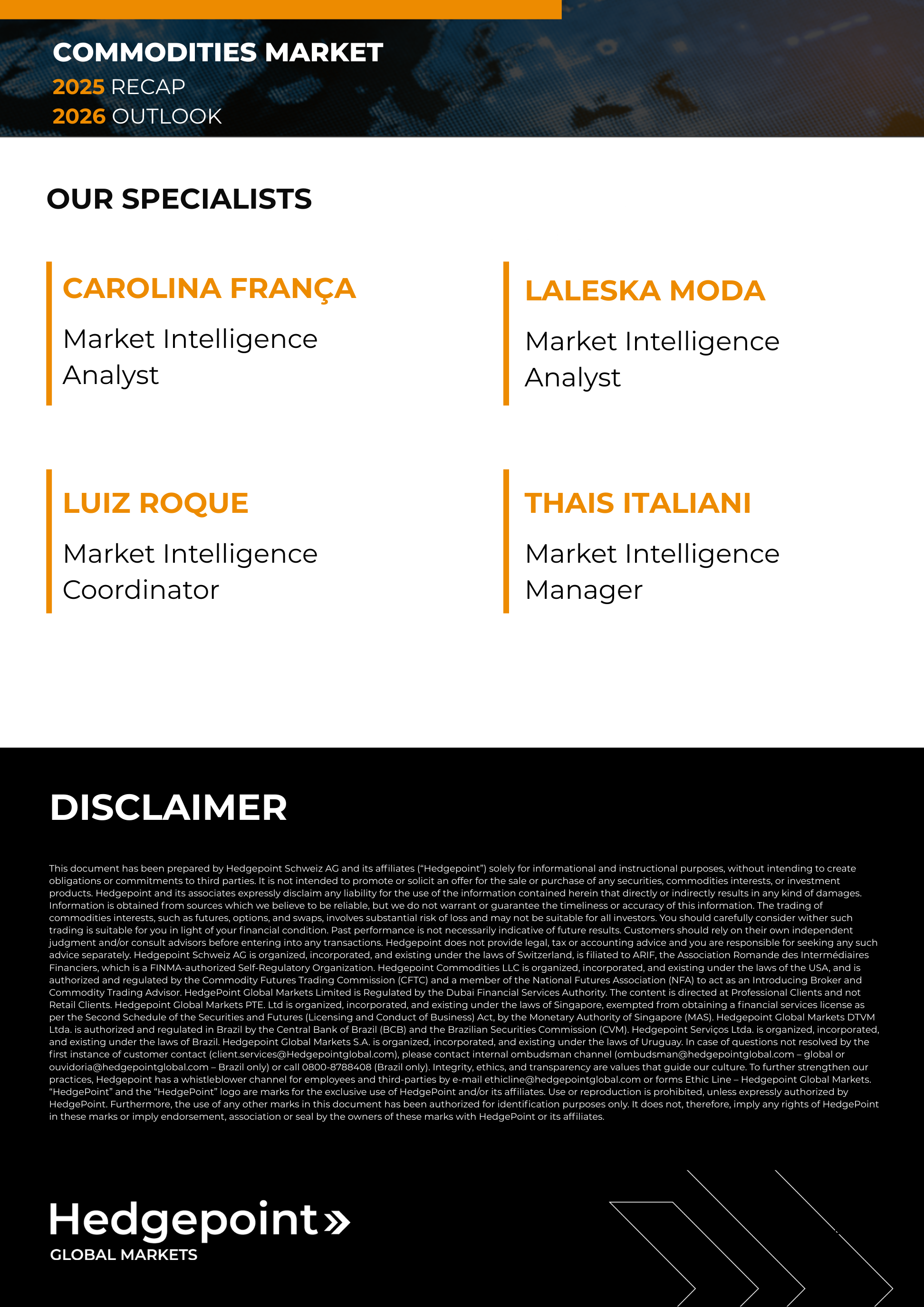 This document has been prepared by Hedgepoint Schweiz AG and its affiliates (“Hedgepoint”) solely for informational and instructional purposes, without intending to create obligations or commitments to third parties. It is not intended to promote or solicit an offer for the sale or purchase of any securities, commodities interests, or investment products. Hedgepoint and its associates expressly disclaim any liability for the use of the information contained herein that directly or indirectly results in any kind of damages. Information is obtained from sources which we believe to be reliable, but we do not warrant or guarantee the timeliness or accuracy of this information. The trading of commodities interests, such as futures, options, and swaps, involves substantial risk of loss and may not be suitable for all investors. You should carefully consider wither such trading is suitable for you in light of your financial condition. Past performance is not necessarily indicative of future results. Customers should rely on their own independent judgment and/or consult advisors before entering into any transactions. Hedgepoint does not provide legal, tax or accounting advice and you are responsible for seeking any such advice separately. Hedgepoint Schweiz AG is organized, incorporated, and existing under the laws of Switzerland, is filiated to ARIF, the Association Romande des Intermédiaires Financiers, which is a FINMA-authorized Self-Regulatory Organization. Hedgepoint Commodities LLC is organized, incorporated, and existing under the laws of the USA, and is authorized and regulated by the Commodity Futures Trading Commission (CFTC) and a member of the National Futures Association (NFA) to act as an Introducing Broker and Commodity Trading Advisor. HedgePoint Global Markets Limited is Regulated by the Dubai Financial Services Authority. The content is directed at Professional Clients and not Retail Clients. Hedgepoint Global Markets PTE. Ltd is organized, incorporated, and existing under the laws of Singapore, exempted from obtaining a financial services license as per the Second Schedule of the Securities and Futures (Licensing and Conduct of Business) Act, by the Monetary Authority of Singapore (MAS). Hedgepoint Global Markets DTVM Ltda. is authorized and regulated in Brazil by the Central Bank of Brazil (BCB) and the Brazilian Securities Commission (CVM). Hedgepoint Serviços Ltda. is organized, incorporated, and existing under the laws of Brazil. Hedgepoint Global Markets S.A. is organized, incorporated, and existing under the laws of Uruguay. In case of questions not resolved by the first instance of customer contact (client.services@Hedgepointglobal.com), please contact internal ombudsman channel (ombudsman@hedgepointglobal.com – global or ouvidoria@hedgepointglobal.com – Brazil only) or call 0800-8788408 (Brazil only). Integrity, ethics, and transparency are values that guide our culture. To further strengthen our practices, Hedgepoint has a whistleblower channel for employees and third-parties by e-mail ethicline@hedgepointglobal.com or forms Ethic Line – Hedgepoint Global Markets. “HedgePoint” and the “HedgePoint” logo are marks for the exclusive use of HedgePoint and/or its affiliates. Use or reproduction is prohibited, unless expressly authorized by HedgePoint. Furthermore, the use of any other marks in this document has been authorized for identification purposes only. It does not, therefore, imply any rights of HedgePoint in these marks or imply endorsement, association or seal by the owners of these marks with HedgePoint or its affiliates.