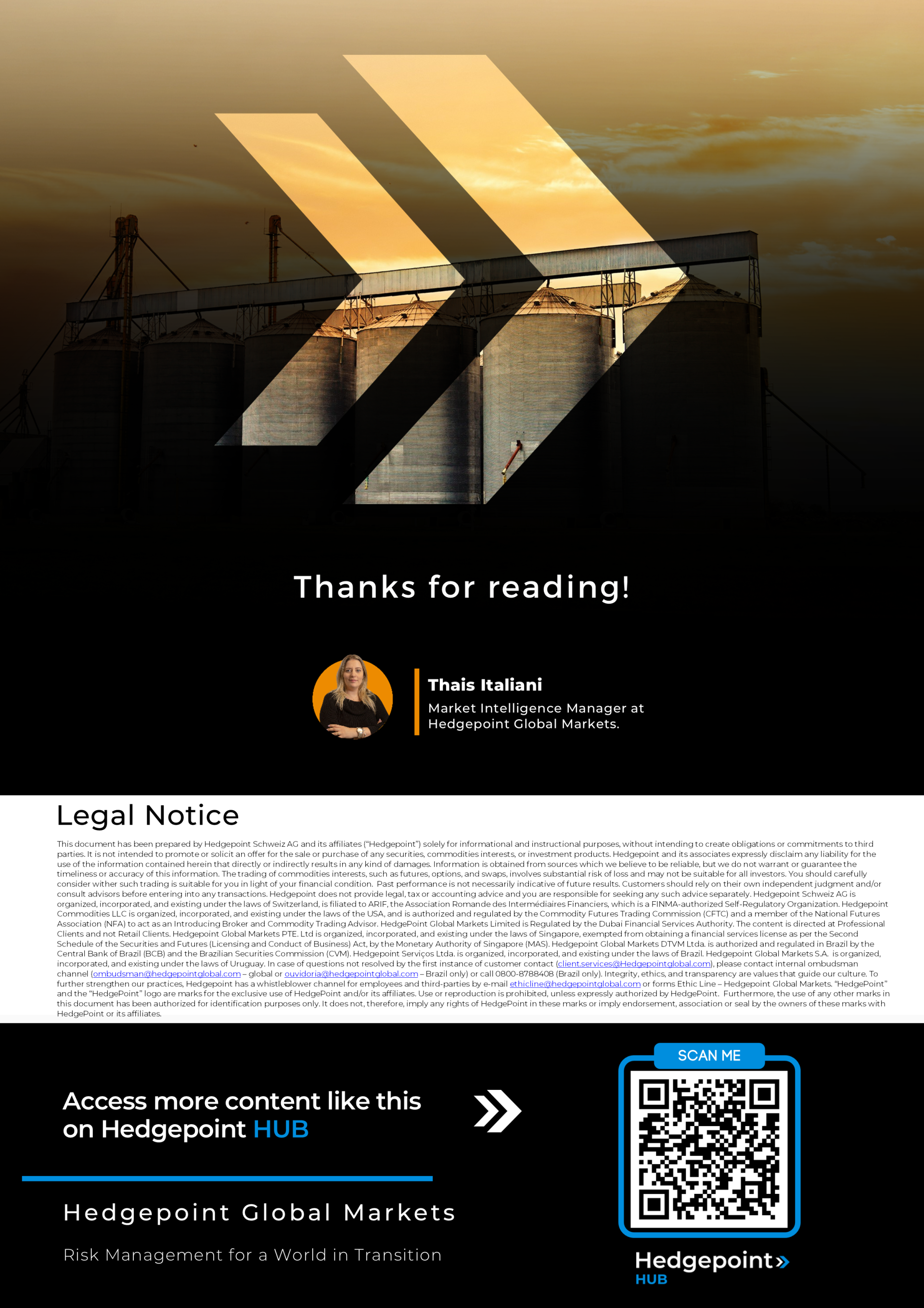 This document has been prepared by Hedgepoint Global Markets LLC and its affiliates (“HPGM”) solely for informational and instructional purposes, without the purpose of instituting obligations or commitments to third parties, nor is it intended to promote an offer, or solicitation of an offer of sale or purchase relating to any securities, commodities interests or investment products. Hedgepoint Commodities LLC (“HPC”), a wholly owned entity of HPGM, is an Introducing Broker and a registered member of the National Futures Association. The trading of commodities interests such as futures, options, and swaps involves substantial risk of loss and may not be suitable for all investors. Past performance is not necessarily indicative of future results. Customers should rely on their own independent judgement and outside advisors before entering in any transaction that are introduced by the firm. HPGM and its associates expressly disclaim any use of the information contained herein that directly or indirectly result in damages or damages of any kind. In case of questions not resolved by the first instance of customer contact (client.services@hedgepointglobal.com), please contact our internal ombudsman channel (ombudsman@hedgepointglobal.com) or 0800-878- 8408/ouvidoria@hedgepointglobal.com (only for customers in Brazil).