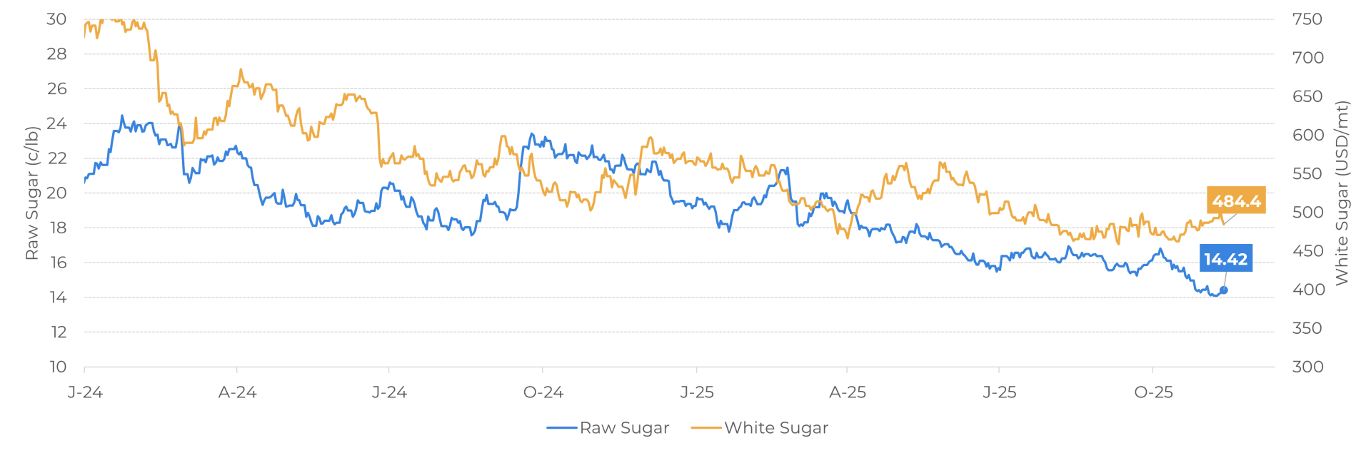 - Raw sugar prices have recently touched a 5-year low, at 14.04 c/lb. Although the contract has returned to the 14-15 c/lb levels this week – partially driven by the macro front – fundamentals remain bearish, with a surplus expected in 25/26.