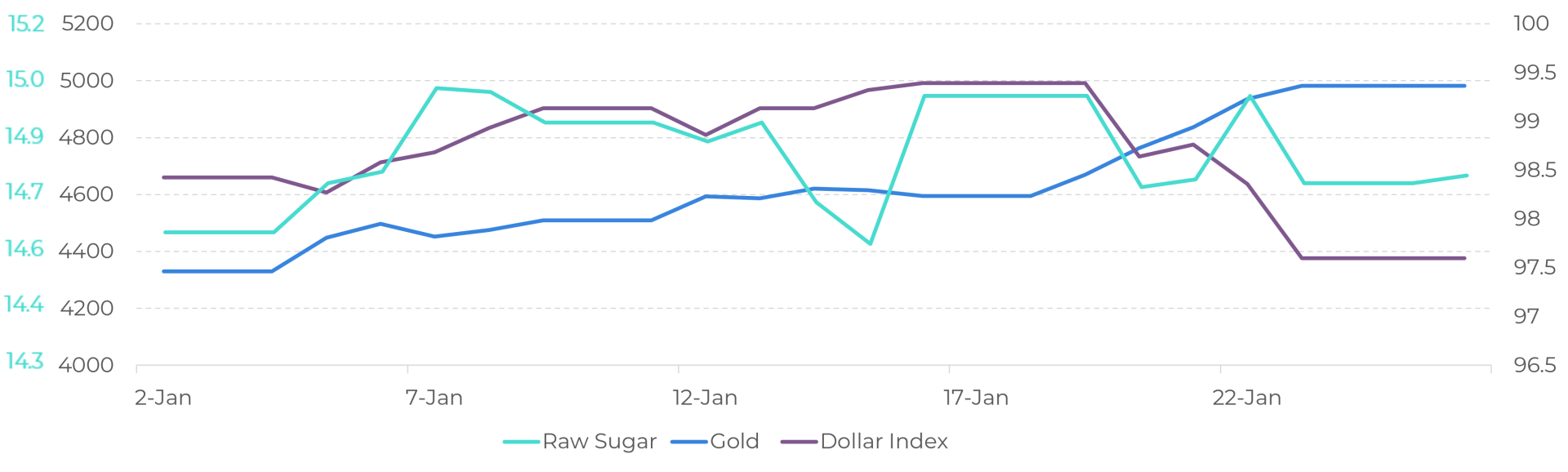 On Thursday (22), sentiment shifted to risk off after Trump announced the suspension of plans to impose new tariffs on the EU and clarified that the US would not use force to acquire Greenland. This was generally supportive of commodities, except for the energy complex, which had been benefiting from lingering uncertainty. Sugar prices rebounded by 1.5% on Thursday, ultimately closing the week at a lower level of 14.7 c/lb on Friday.