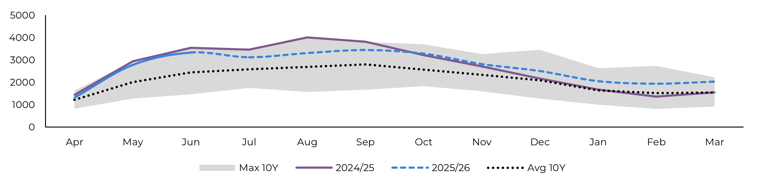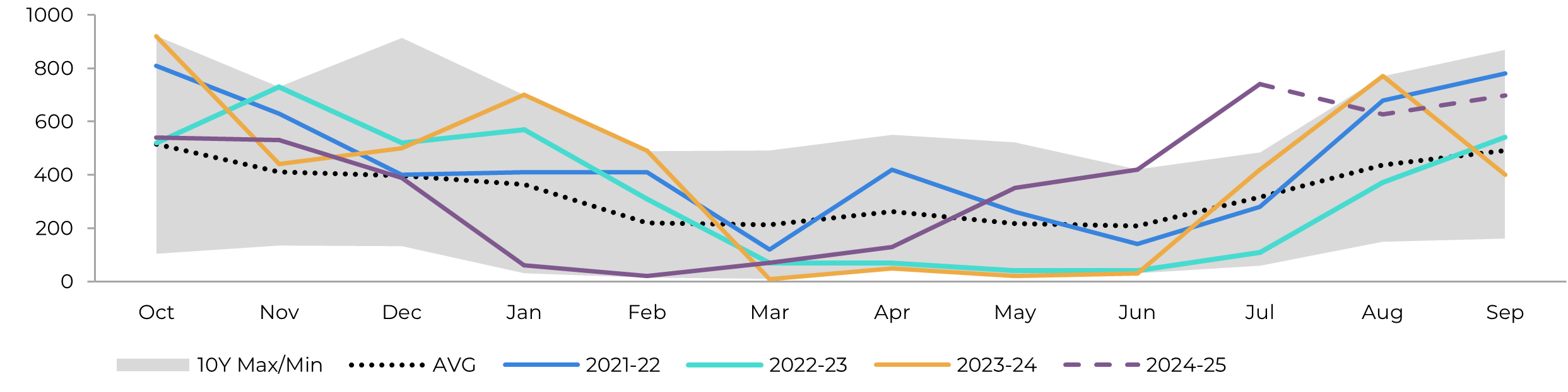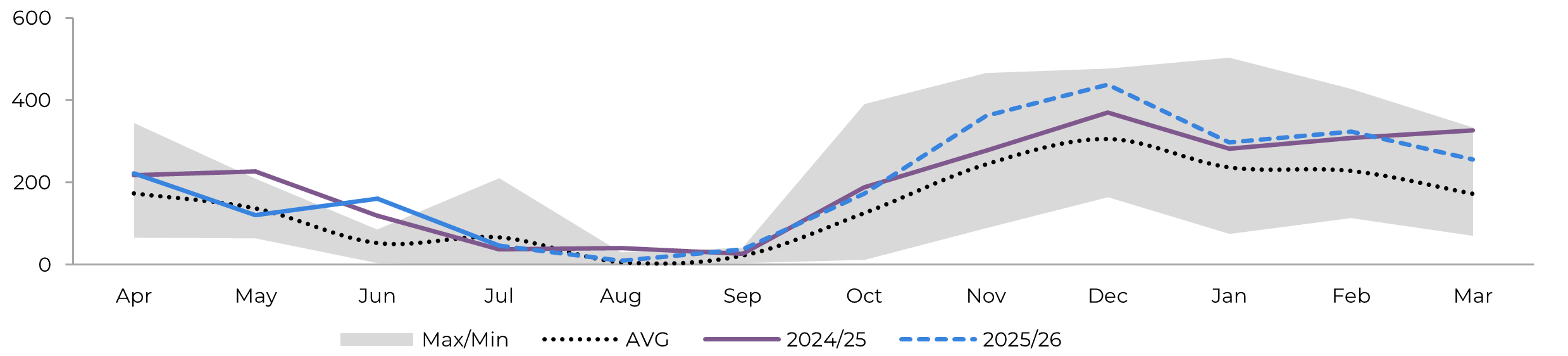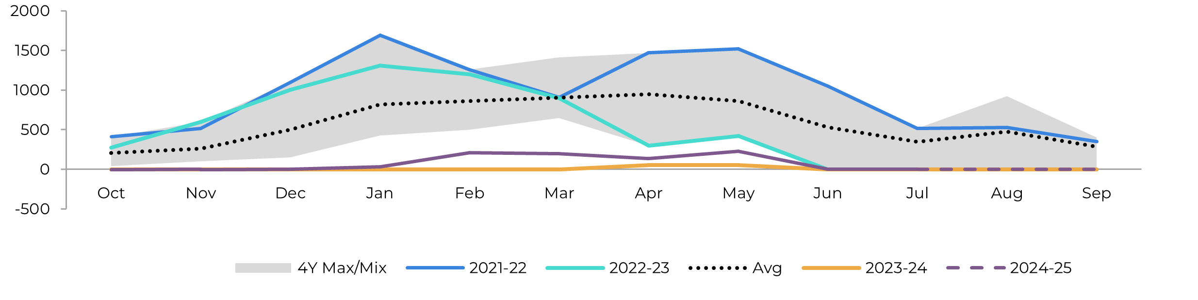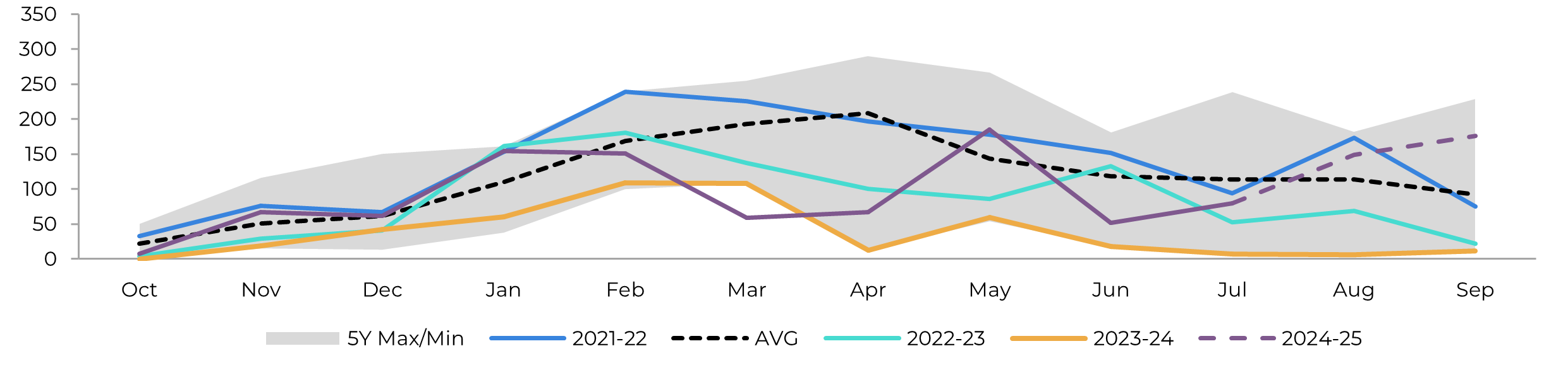 Regarding exports, our initial forecast was conservative, at 500 kt. However, factoring in the unused 200 kt from 2024/25 and ISMA’s request for the government to authorize around 2 Mt of exports, we’ve revised our projection upward to 1.5 Mt. At this level, India would continue to stock less than its three-month consumption target, a trend observed over the past five seasons.