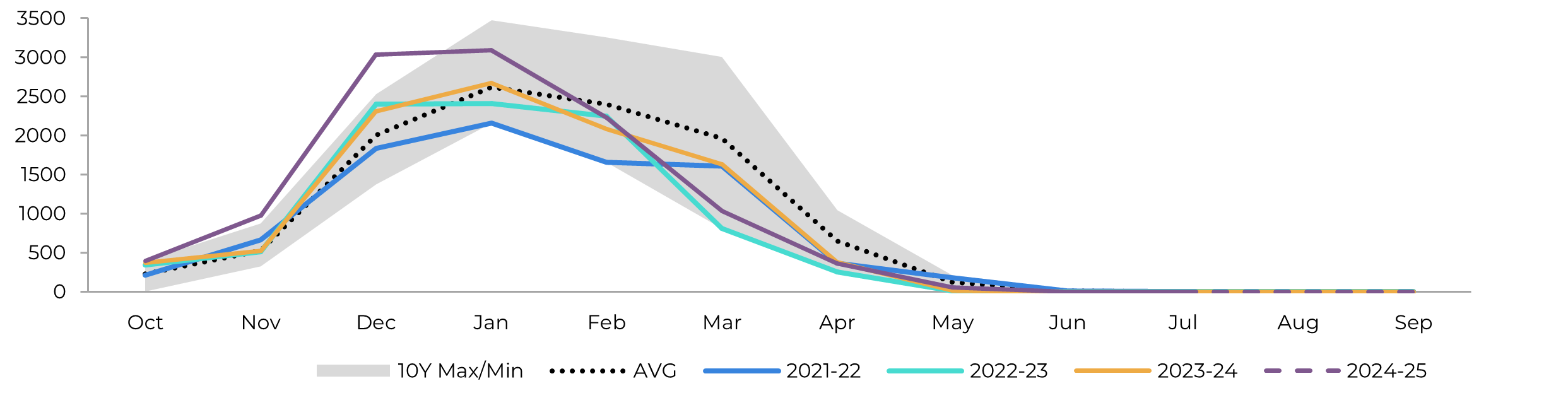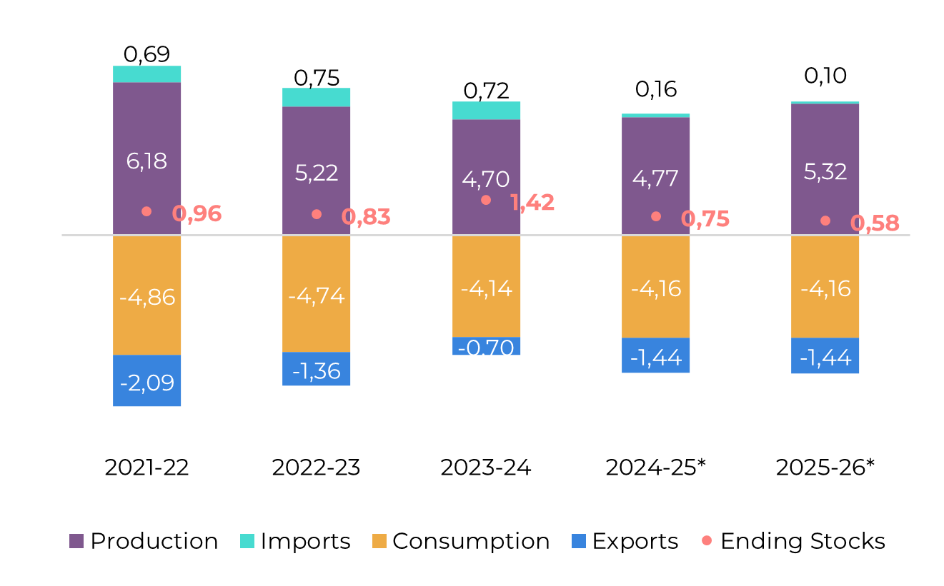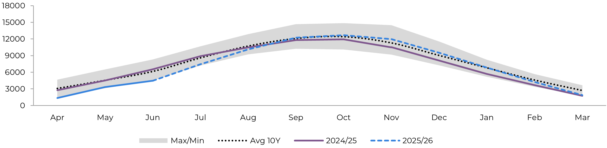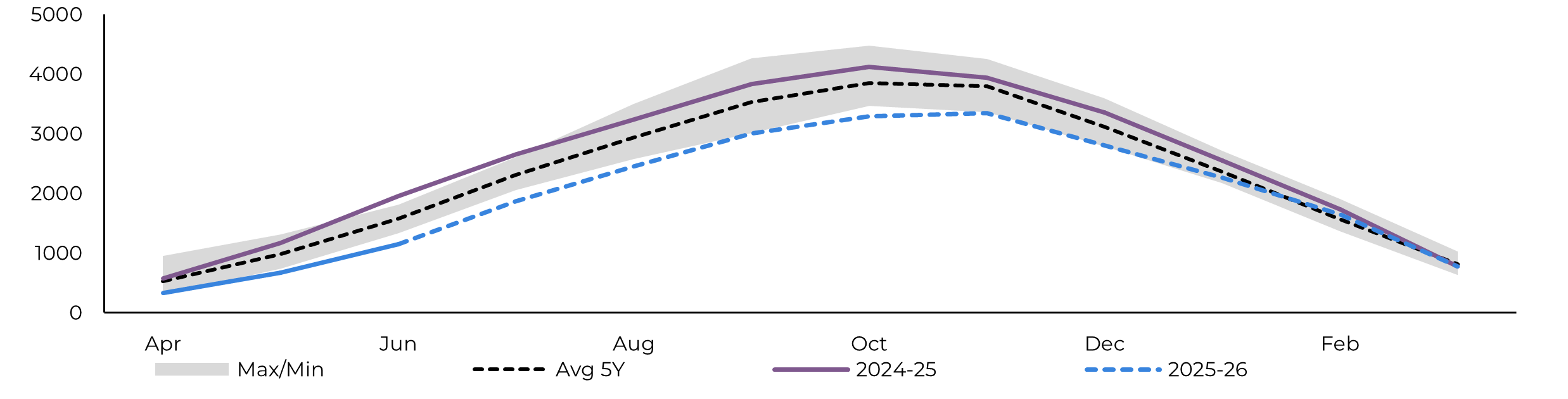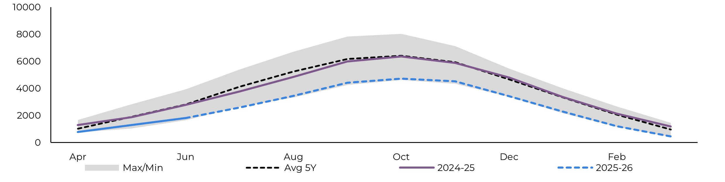 Regarding exports, our initial forecast was conservative, at 500 kt. However, factoring in the unused 200 kt from 2024/25 and ISMA’s request for the government to authorize around 2 Mt of exports, we’ve revised our projection upward to 1.5 Mt. At this level, India would continue to stock less than its three-month consumption target, a trend observed over the past five seasons.