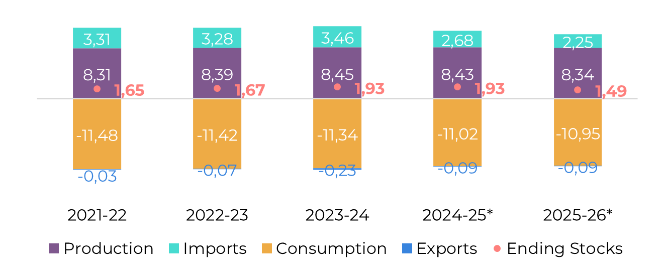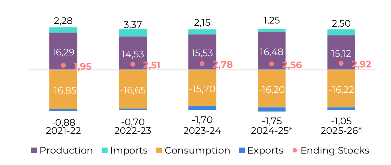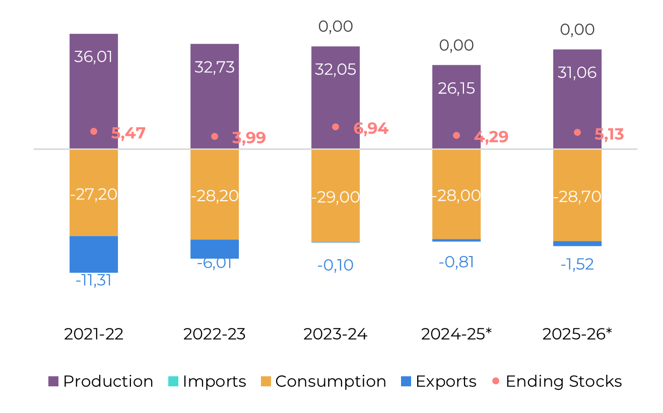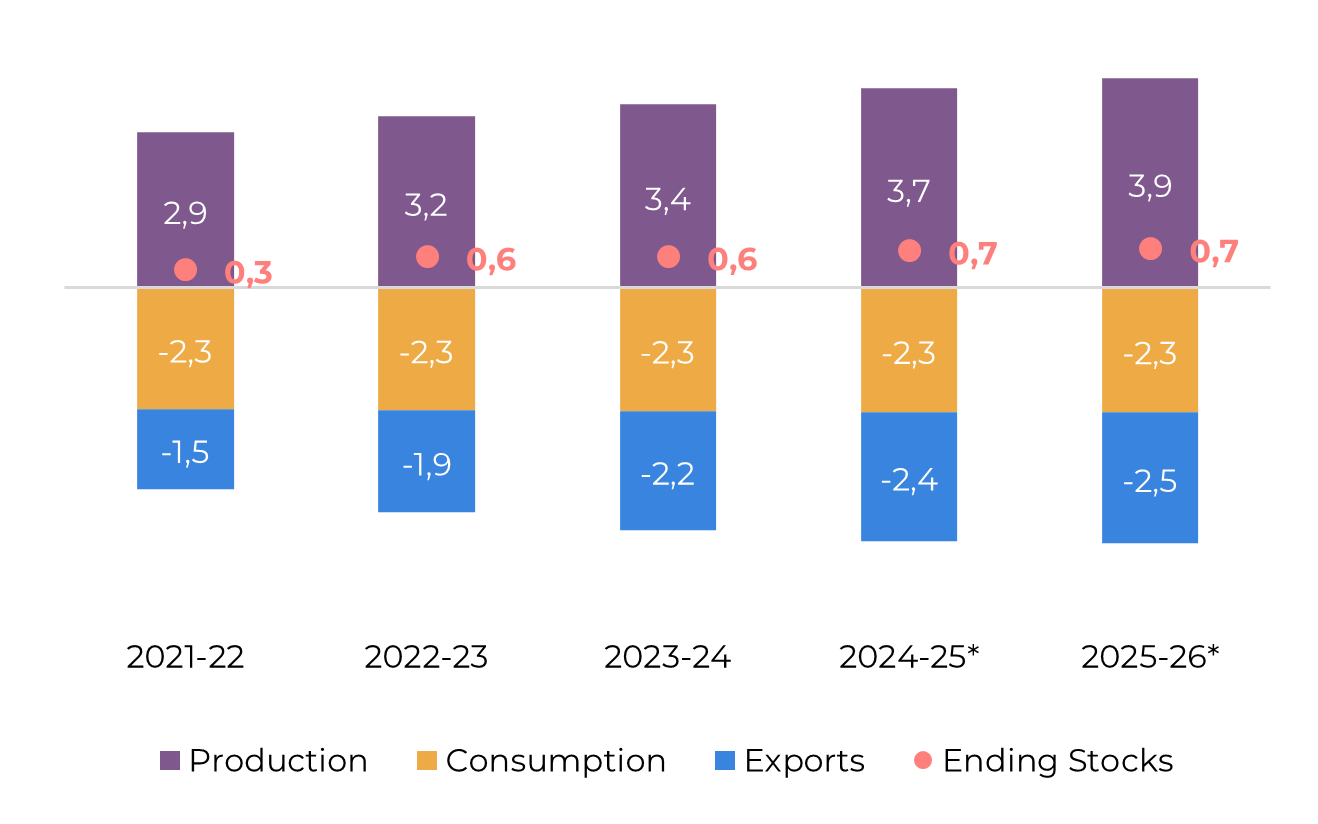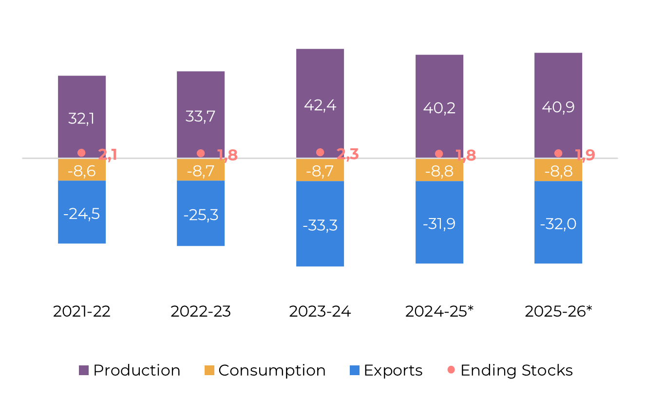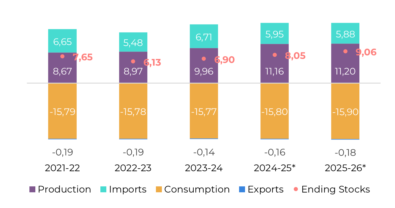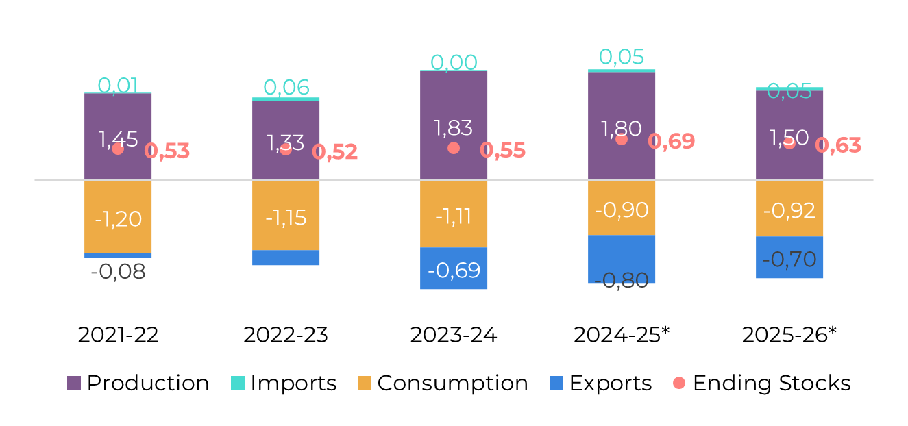 Regarding exports, our initial forecast was conservative, at 500 kt. However, factoring in the unused 200 kt from 2024/25 and ISMA’s request for the government to authorize around 2 Mt of exports, we’ve revised our projection upward to 1.5 Mt. At this level, India would continue to stock less than its three-month consumption target, a trend observed over the past five seasons.