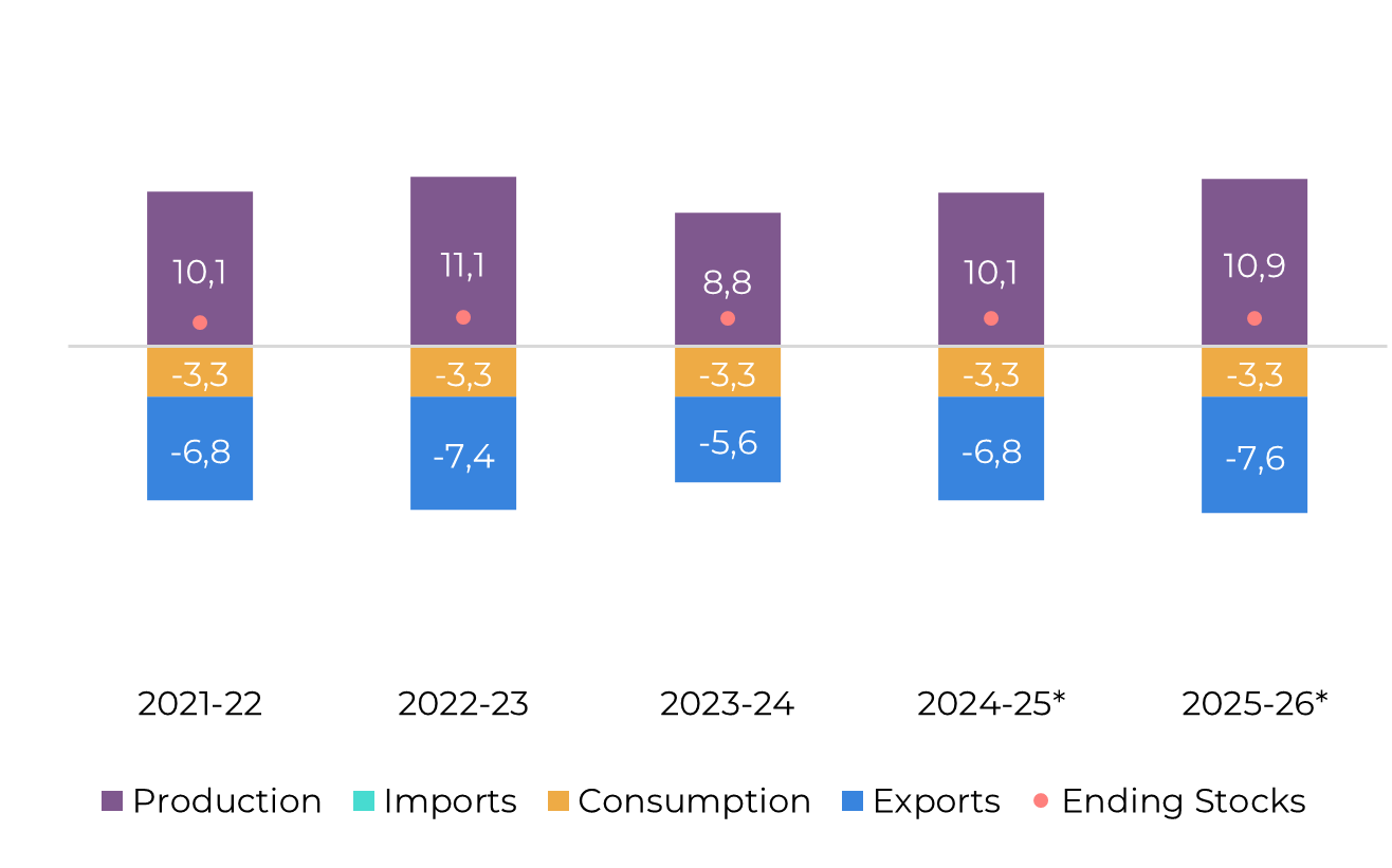 "Trade flows are expected to remain bearish, with a projected surplus exceeding 2.5 Mt between Q3 2025 and Q3 2026. While seasonal factors, such as Brazil’s intercrop period and low domestic ethanol stocks, may offer some price support, the surplus anticipated between Q3 and Q4 2025 is likely to dampen any significant recovery momentum possibly happening at the beginning of 2026. Additional pressure comes from increased global availability, particularly from countries like India."