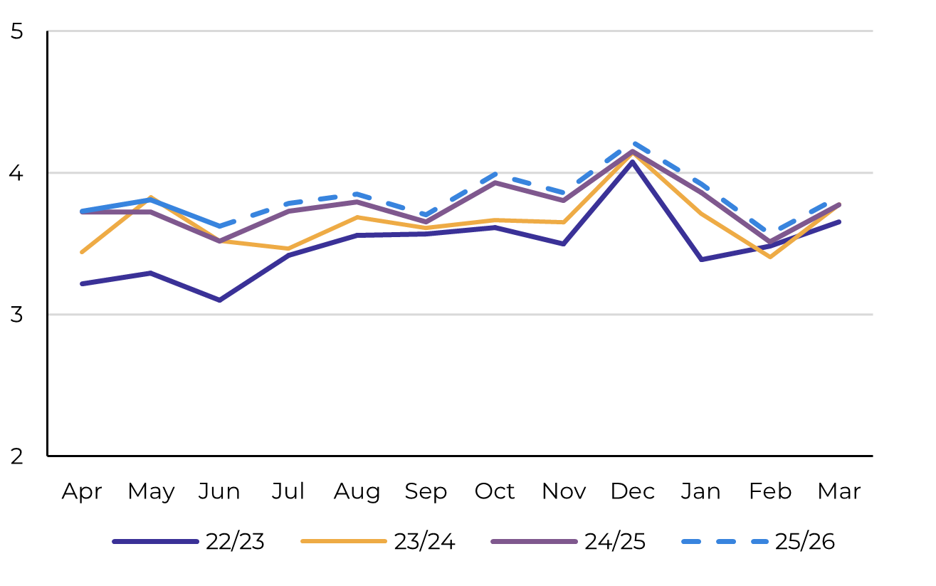 The 25/26 season is underperforming relative to expectations, largely due to the lingering effects of 2024’s fires and early-2025 dryness, despite the beneficial rains received late last year. These conditions have pressured both TCH and TRS results so far.