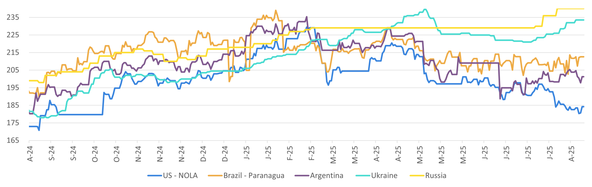 • Relevant climate risk: NOAA projects a 60% chance of La Niña in 2025, which could bring drought to Argentina and southern Brazil, affecting yields.