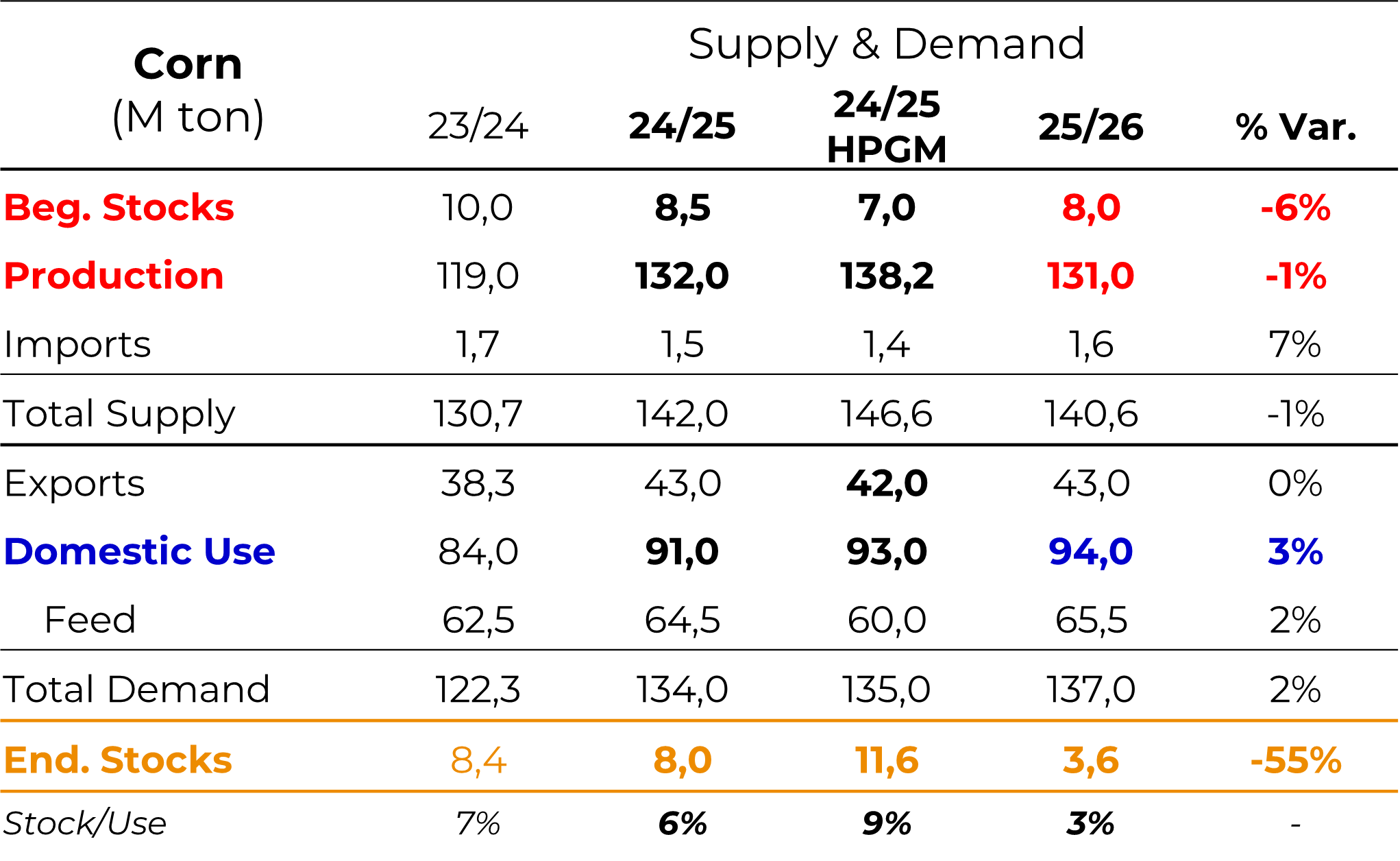 • Current production estimated at 50 M tons, with the possibility of an increase for 2025/26, given that corn margins exceed those of soybean. The area is expected to grow.