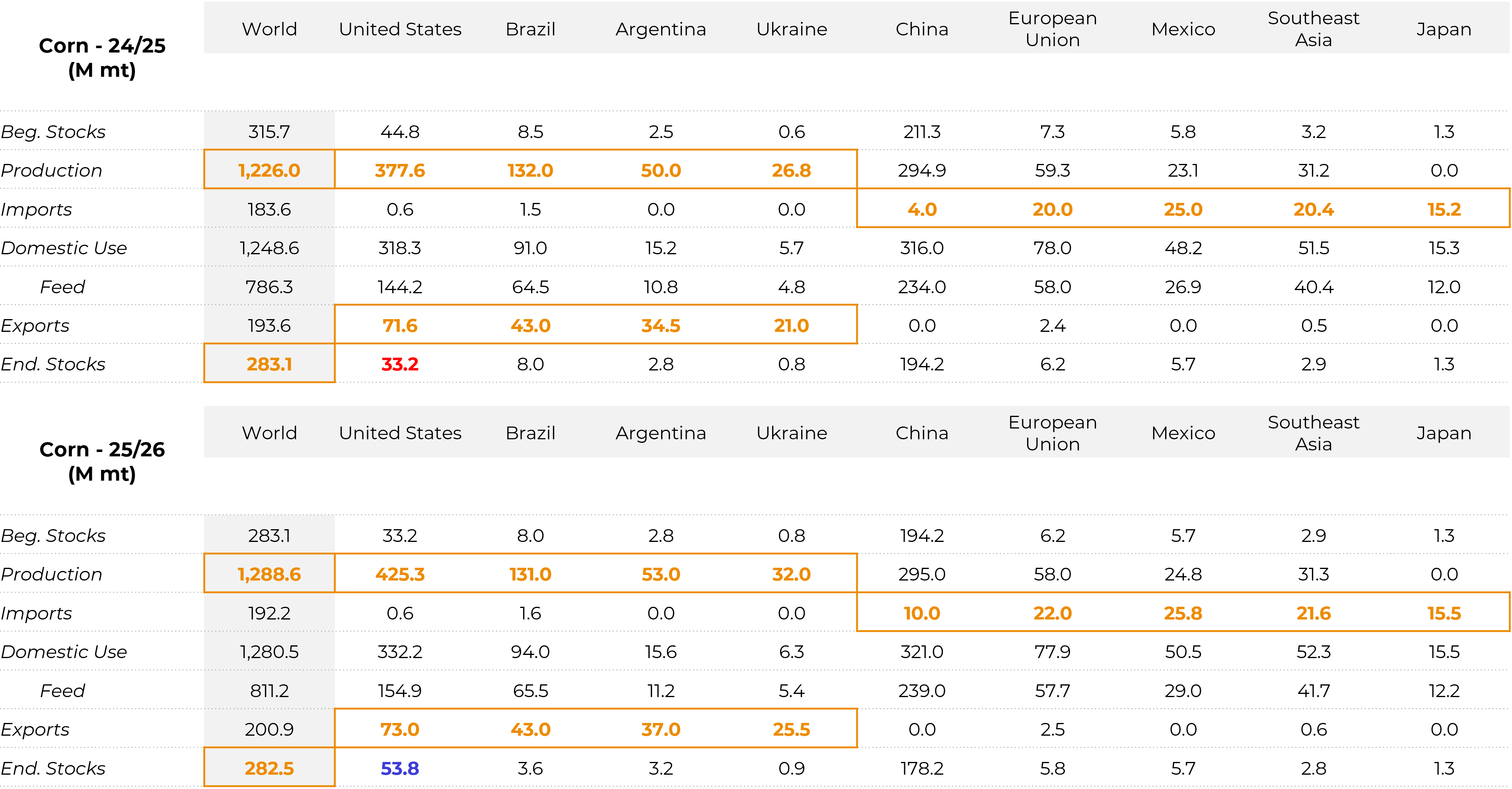 The 2025/26 cycle begins with expectations of a robust supply. World production is expected to grow by more than 60 million tons regarding the previous cycle, driven by the USA. However, demand is also advancing significantly, sustained by consumption for feed and growth in industrial use, mainly for ethanol. The global picture signals an abundance of supply, but with important nuances: any climatic mismatch in South America or unexpected increase in Chinese demand could alter the balance.