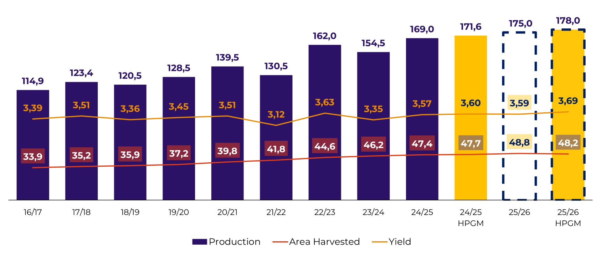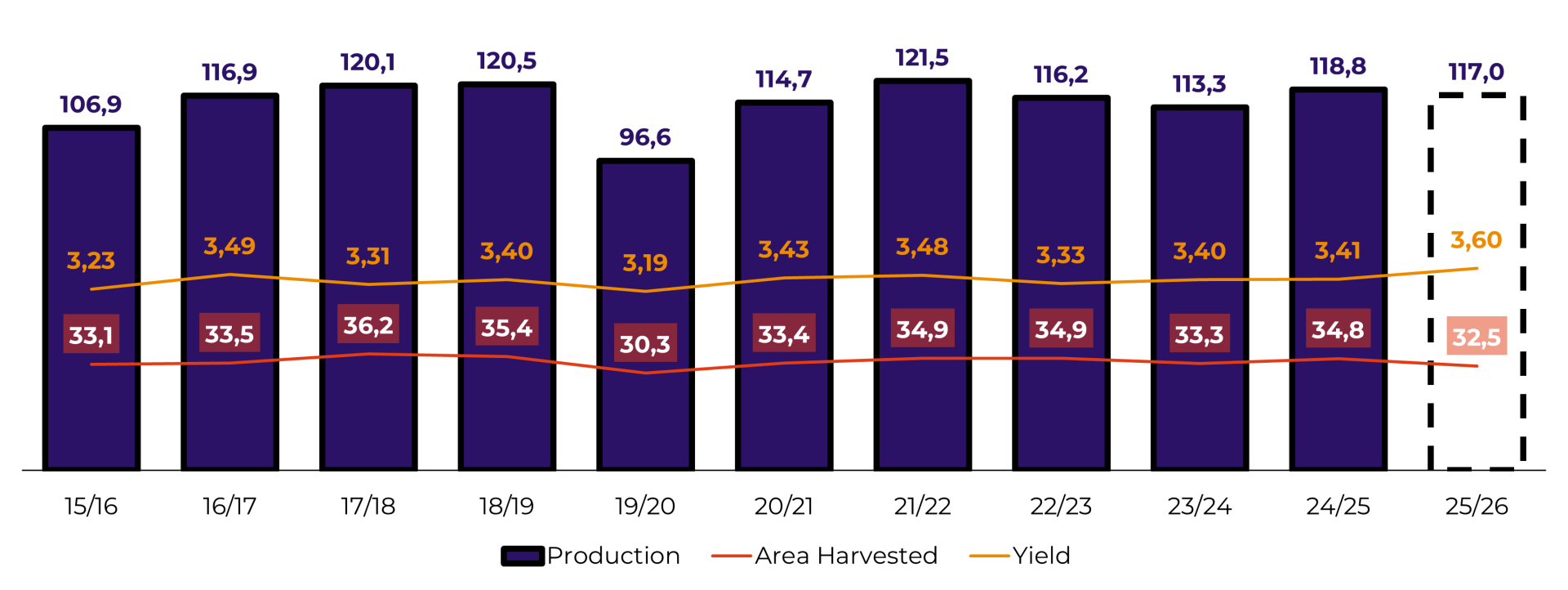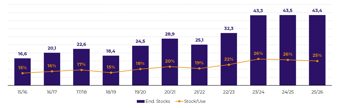 - Crop 2025/26: estimated at 117 M tons, down on the previous season. The result reflects a strong reduction in planted area, partially offset by a likely record yield.