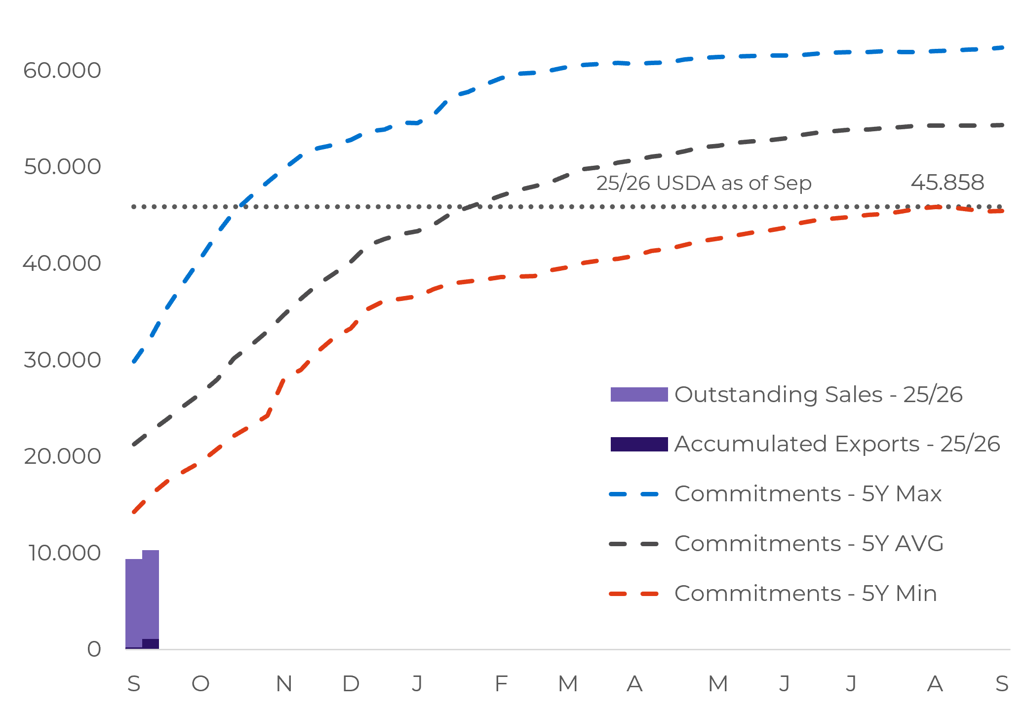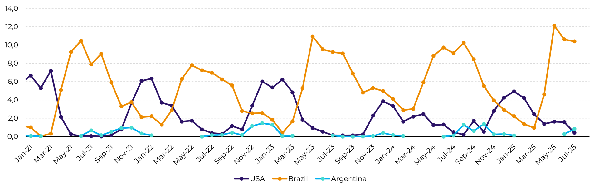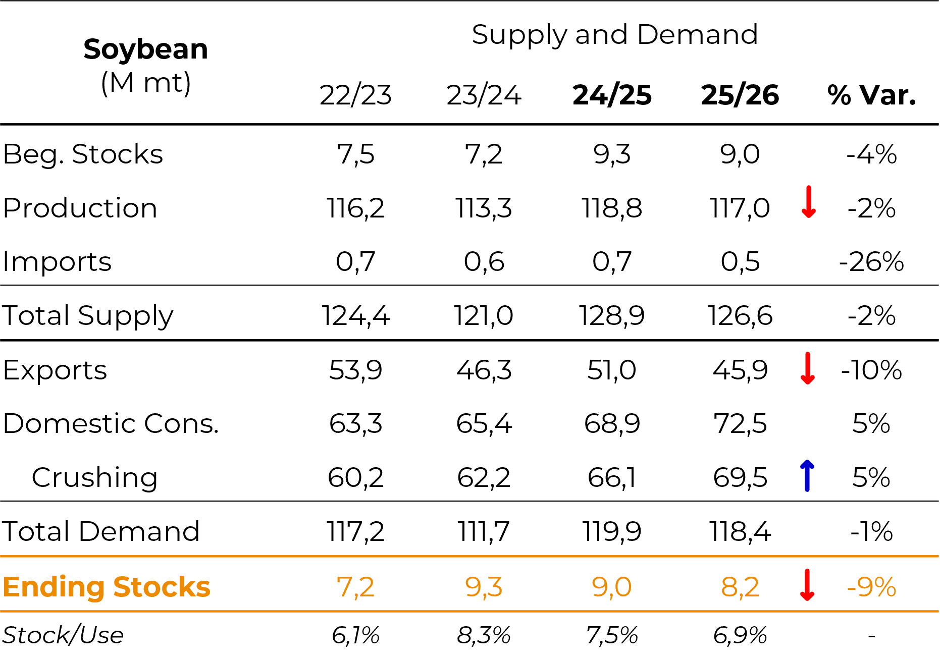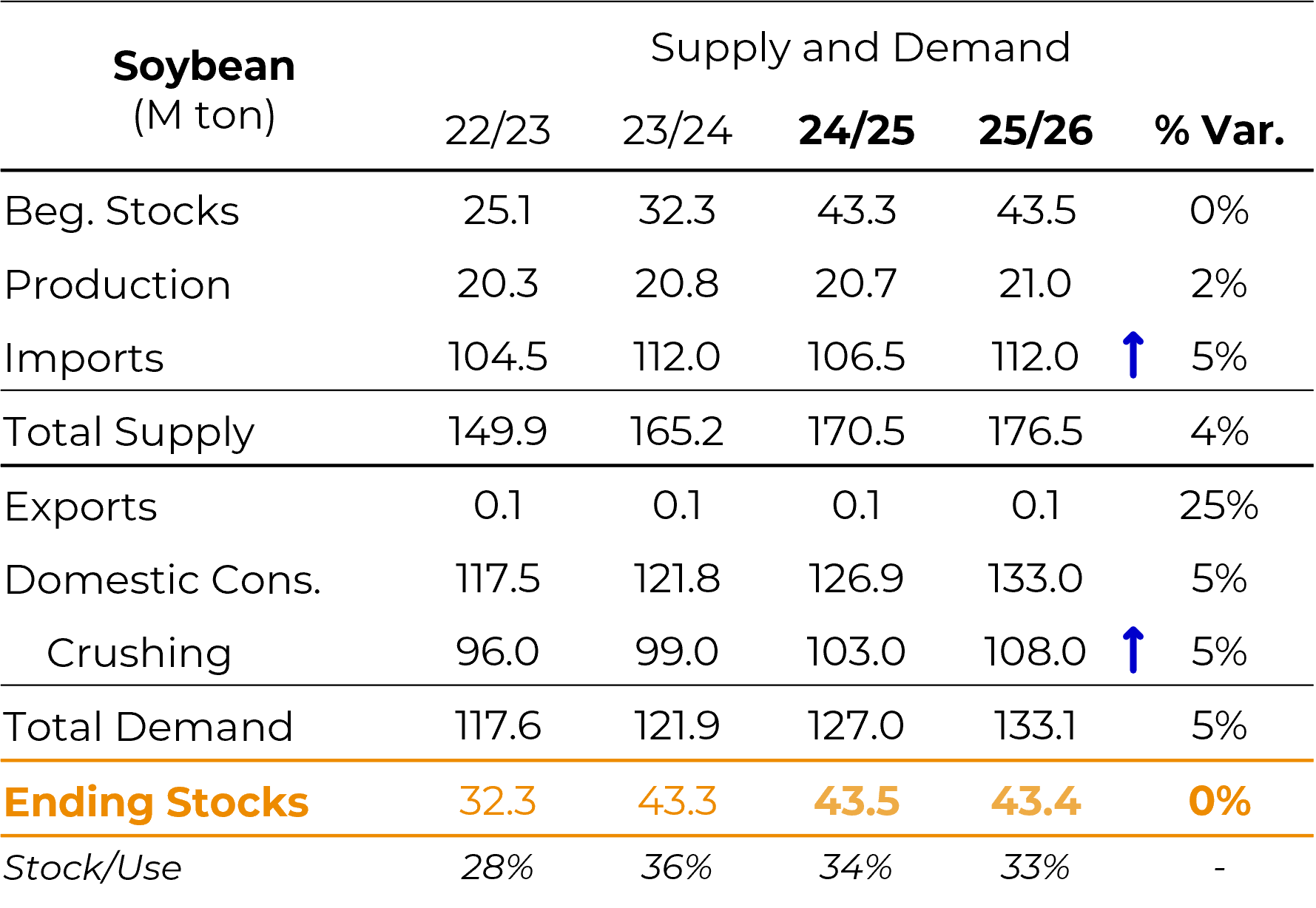 - Stocks: around 43-44 M tons, enough to cover almost three months of domestic consumption. This level reduces the urgency of purchases in the short term and allows for greater selectivity when originating soybean.