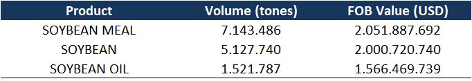 At this point, we would like to point out that up until the date of our presentation (24), the tax cut was still in effect, and rumors were pointing to Chinese importers buying around 1.3 million tons of Argentine soybeans. However, the following day (25), the Argentine government announced the cancellation of the tax cut, citing that the target volume of dollars generated by exports had already been reached. On Friday (26), official figures showed the results of exports during the tax exemption period: