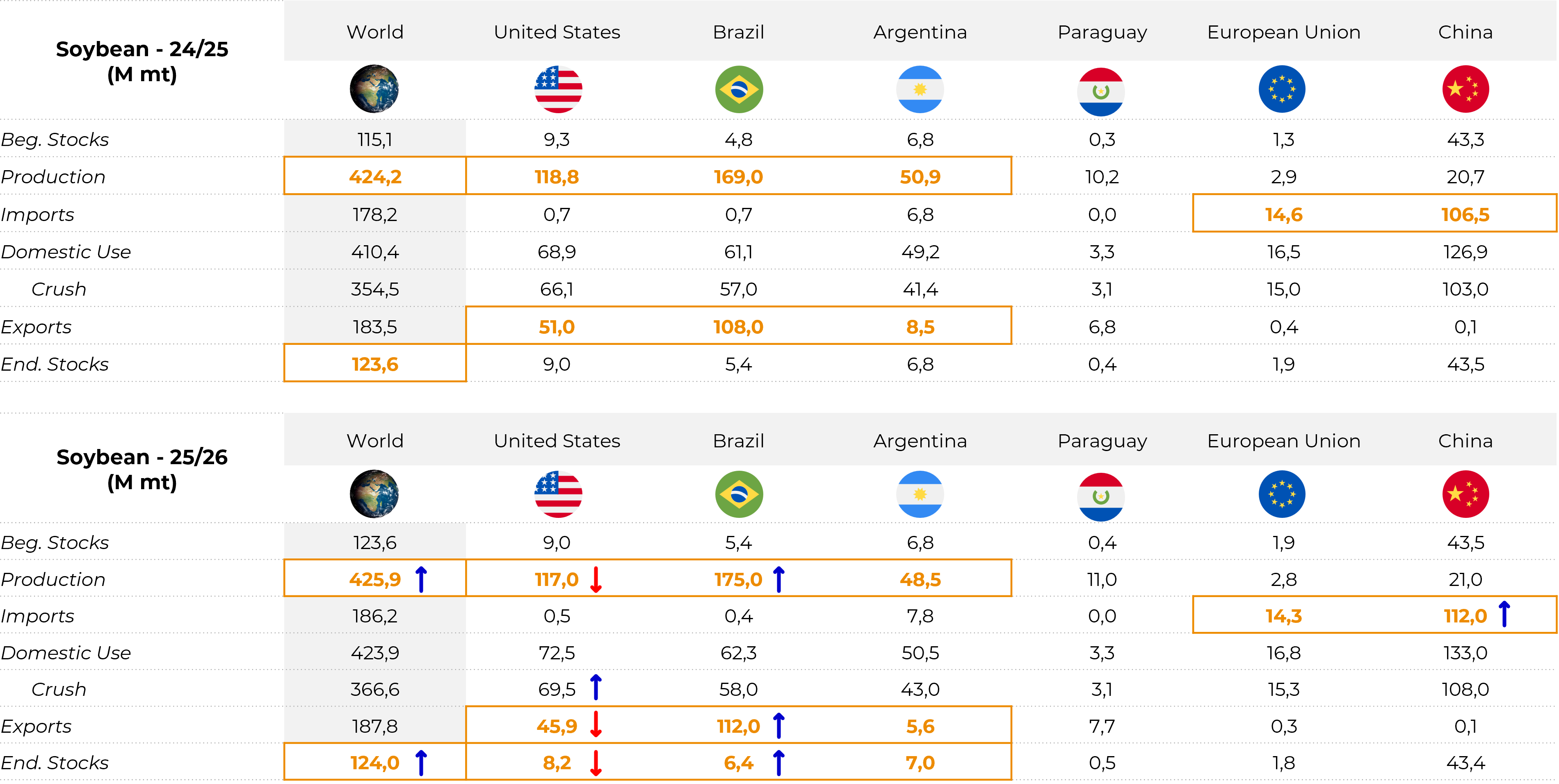 Season 2025/26: estimated at 112 M tons, supported by crushing and high stocks. - Origin of purchases: Brazil continues to be the dominant supplier, benefiting from its large availability. The US is losing ground due to tariffs, while Argentina is temporarily expanding its presence, taking advantage of the recent export tax cut.