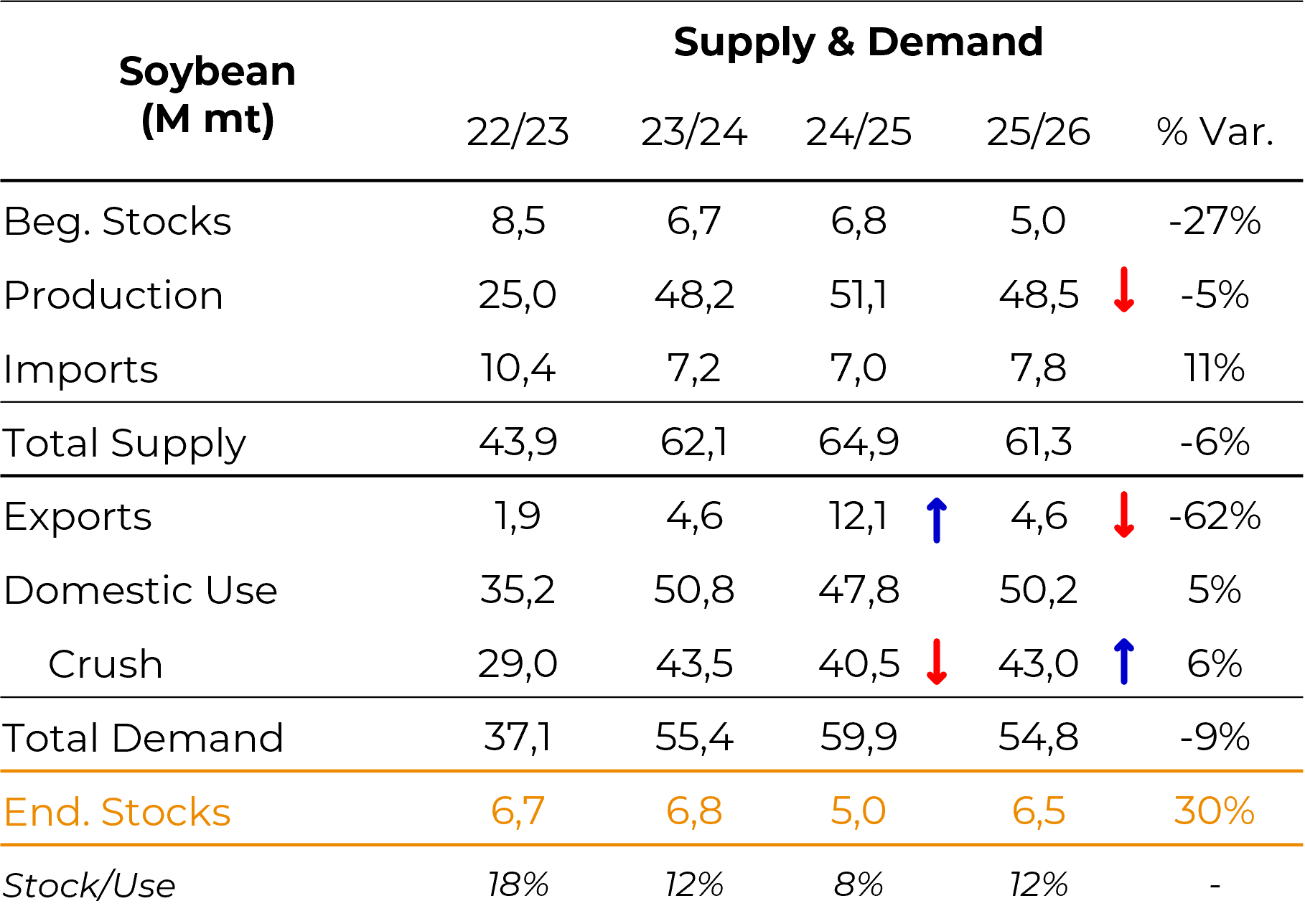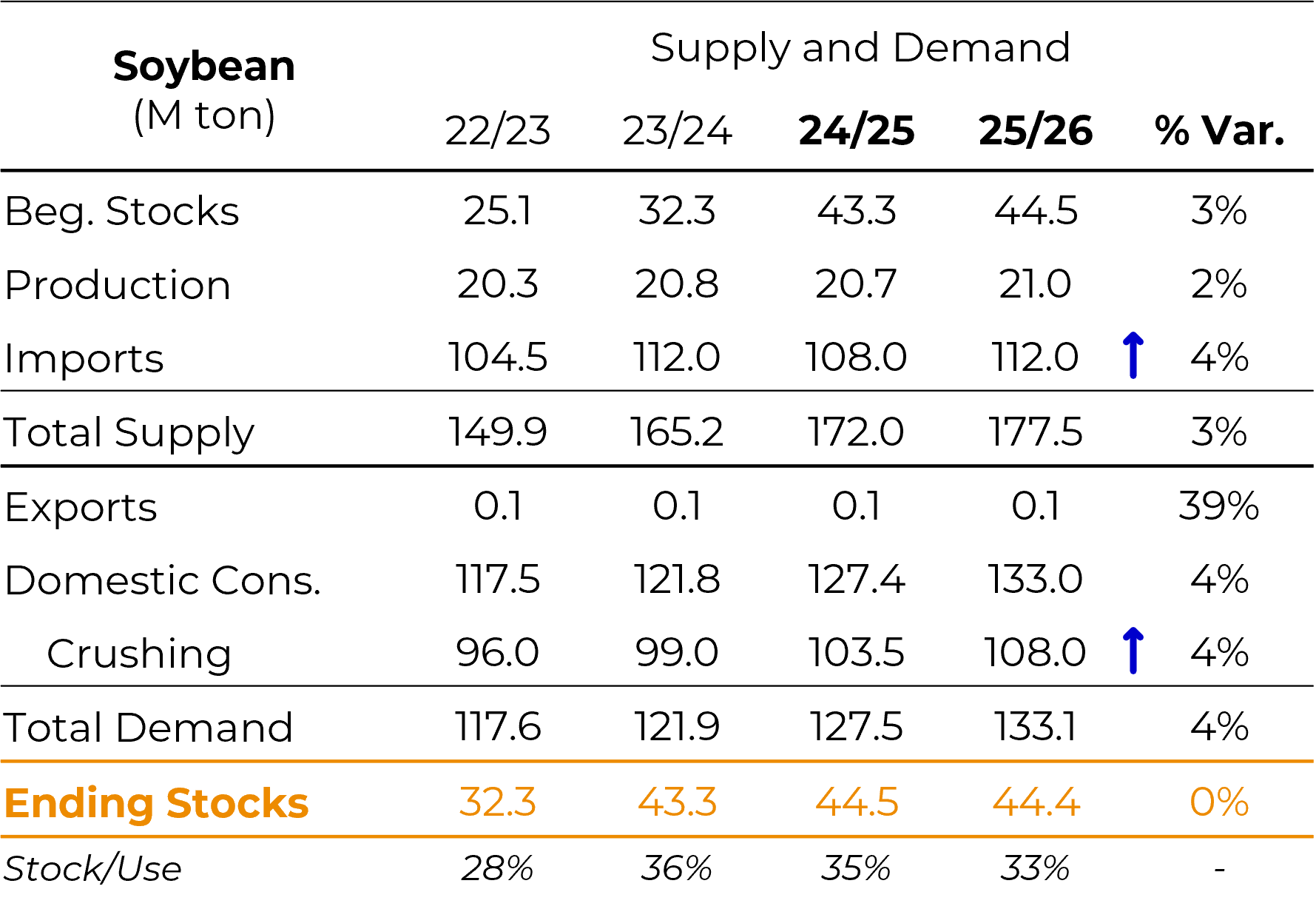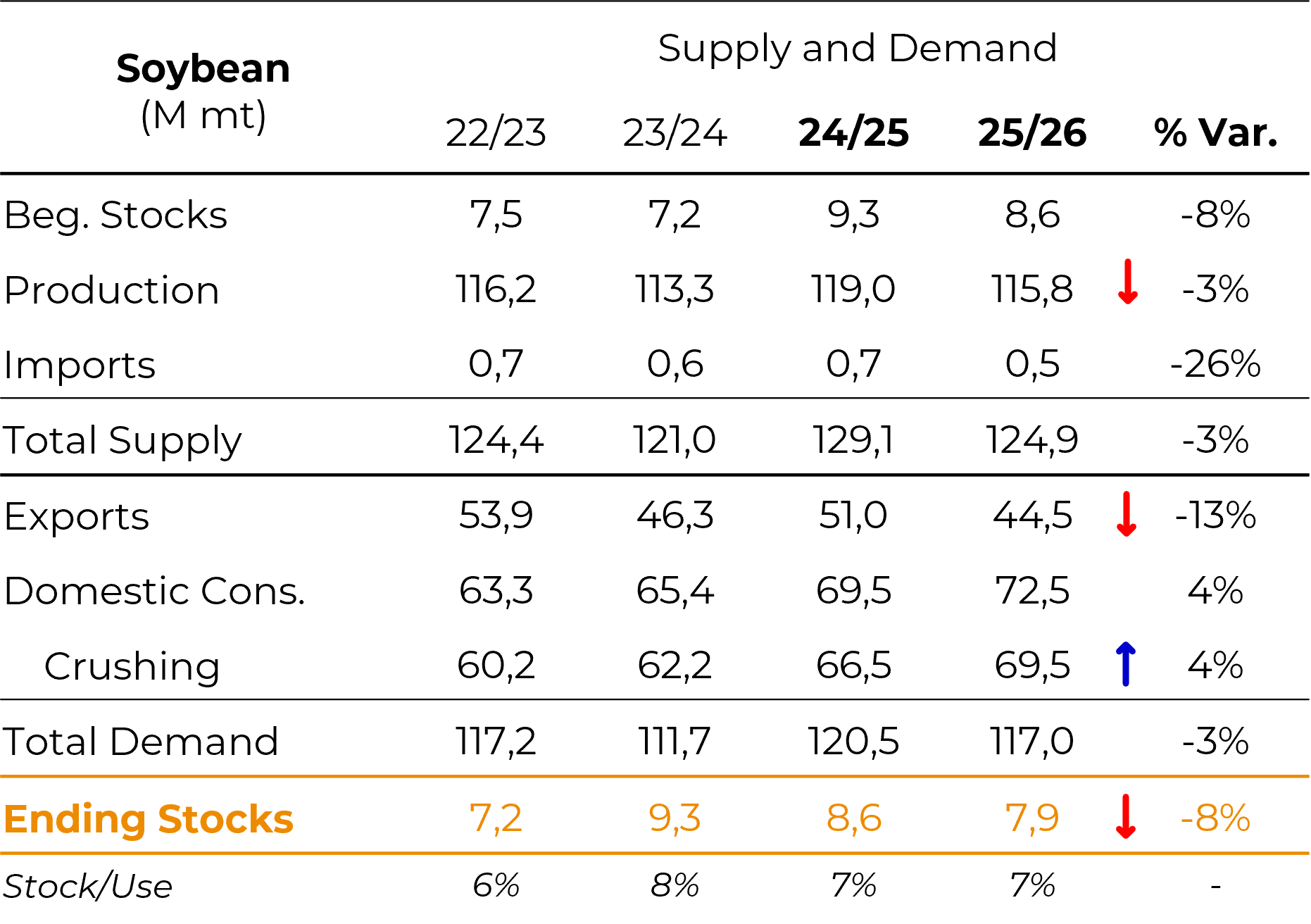 - 25/26 crop: Trend toward smaller soybean area (tight margins), with estimated production of 48.5 million tons. Exports should "return to normal" (4-6 million tons). La Niña may affect crop development, requiring monitoring.