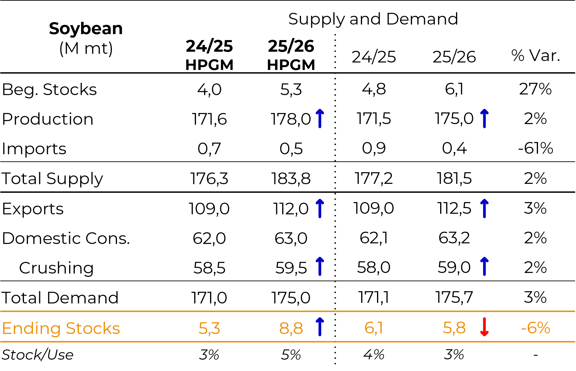 - Crop: Projected at 178 million tons for 2025/26, with room for adjustments. The stock-to-use ratio may rise from 3% to 5%, with more comfortable stocks. Exports are expected to close 2024/25 at a record level of 109 million tons, supported by Chinese demand.