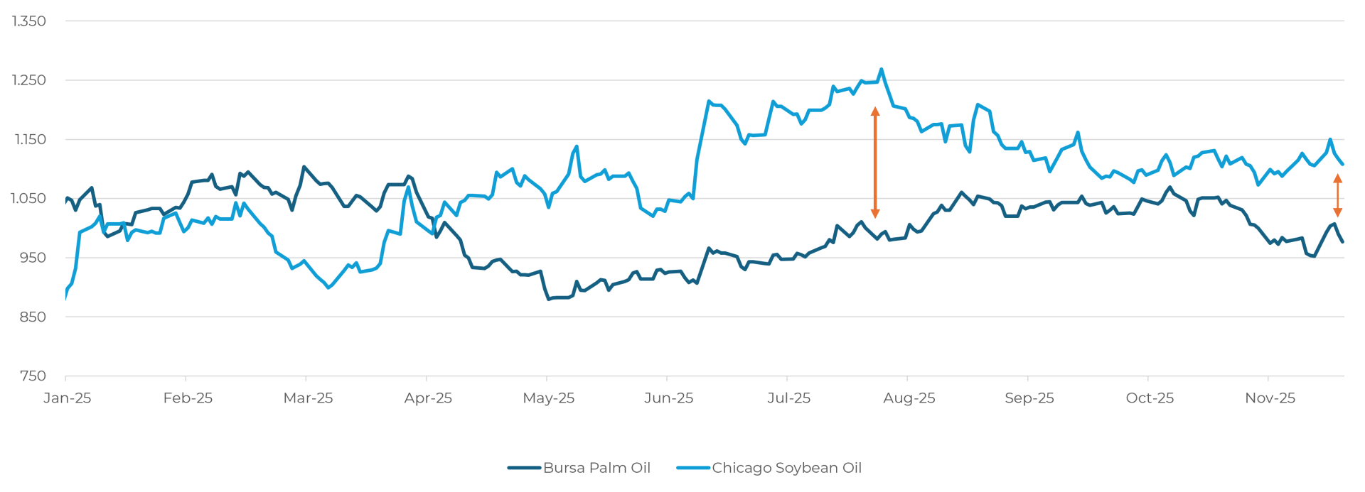 - Prices: The spread between soyoil and palm oil narrowed again after peaking in August, reducing the competitiveness of palm oil by-products. Regarding the relationship, it may change in 2026, requiring attention.