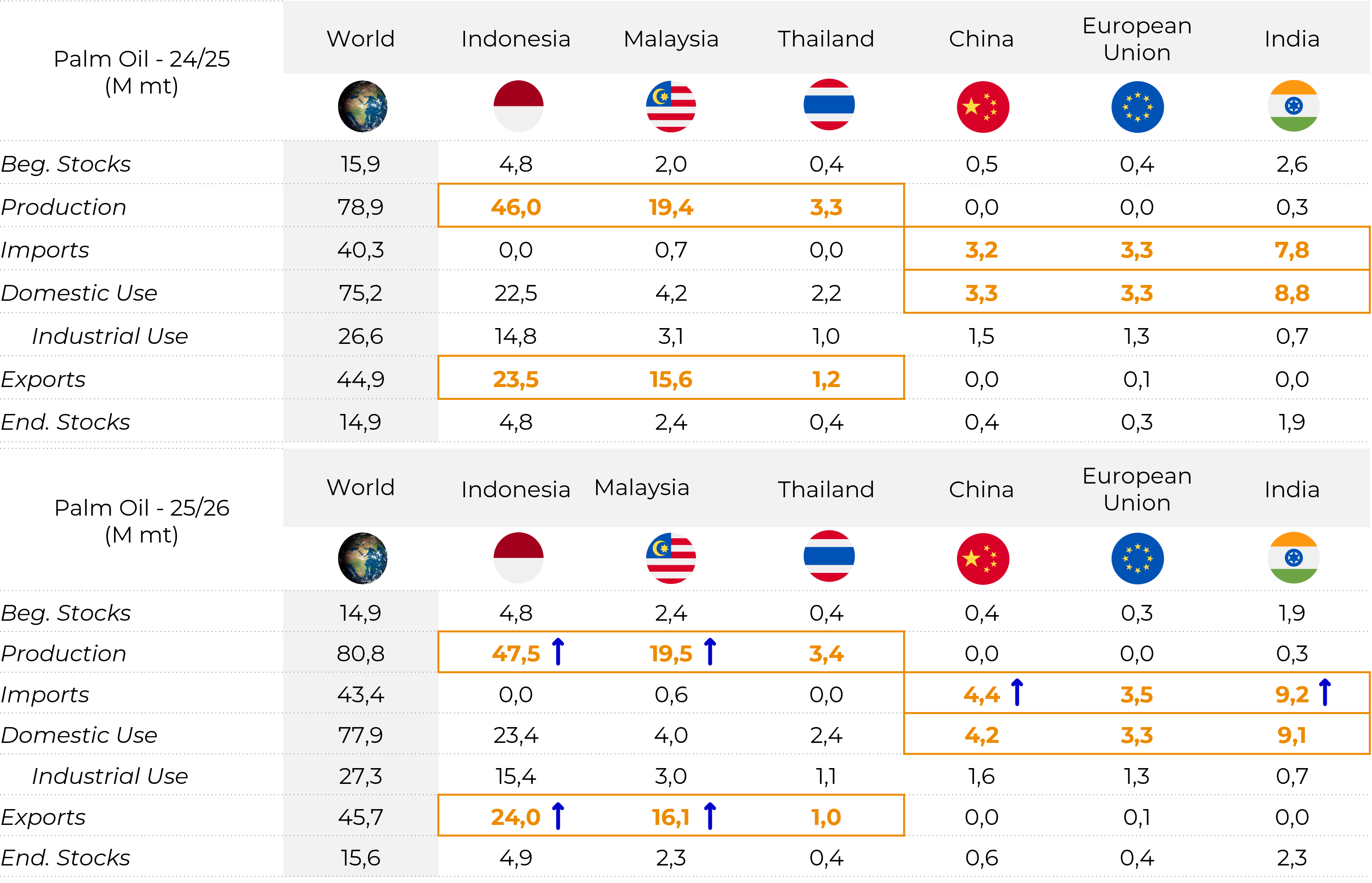 - Production and exports: Upward trend in Indonesia and Malaysia in 2025/26. India and China remain the main drivers of demand for palm oil from Southeast Asia.