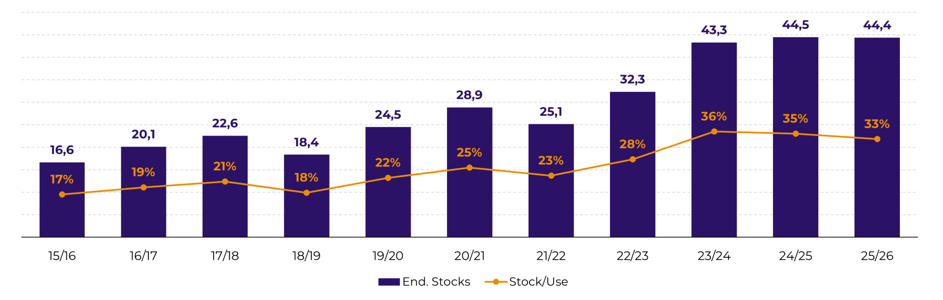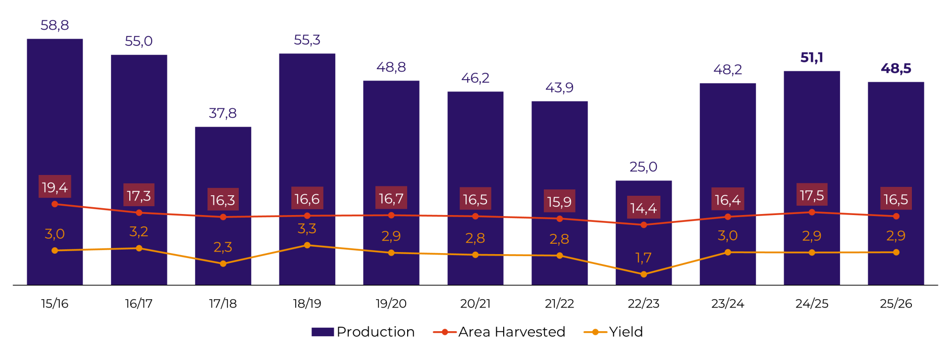 - Production: The USDA revised the 2025/26 crop to 115.8 million tons (down from the previous estimate), despite record yield. A reduction in the planted area (approximately -2.5 million ha) limited production potential.